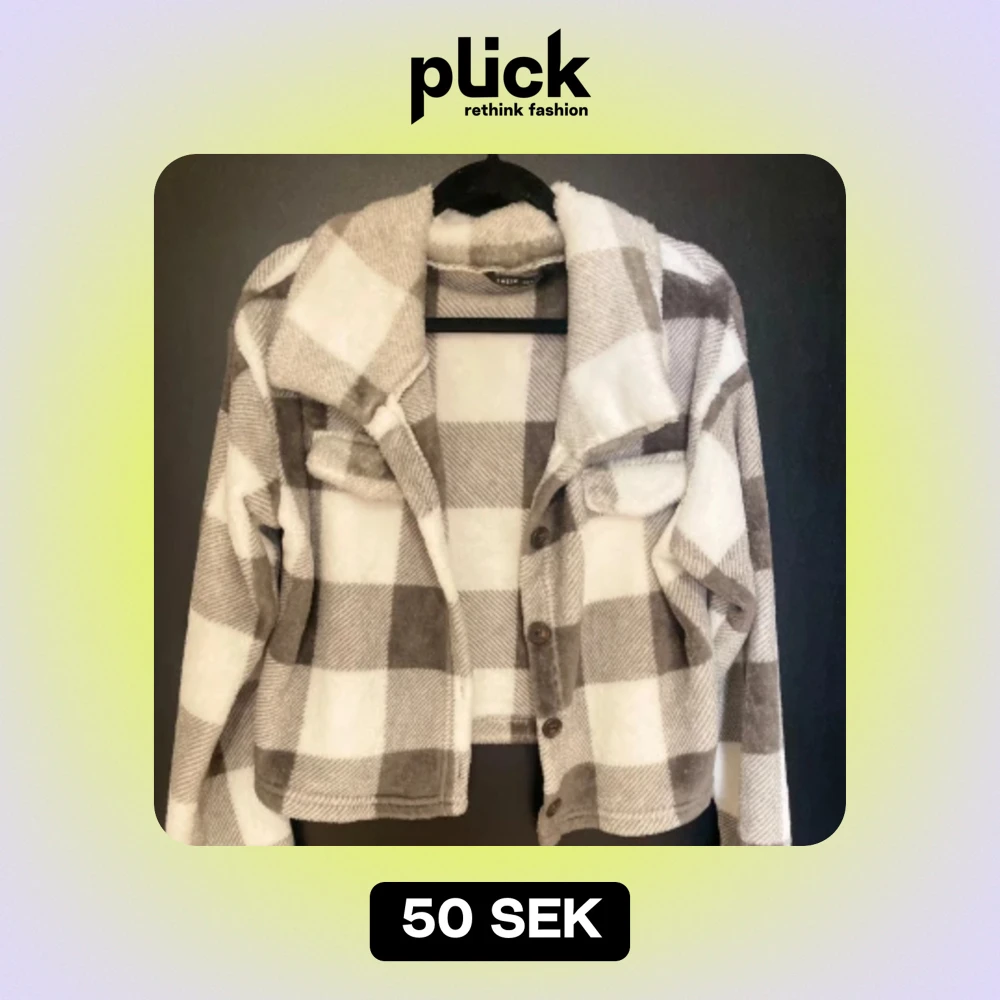 Säljer en supermysig och trendig rutig fleecejacka från Shein. Den är i en snygg geå och vit färgkombination. Jackan har långa ärmar och knappar framtill. Perfekt för höst och vår när du vill vara både varm och stilren. Den är i storlek S och passar perfekt för en casual look.