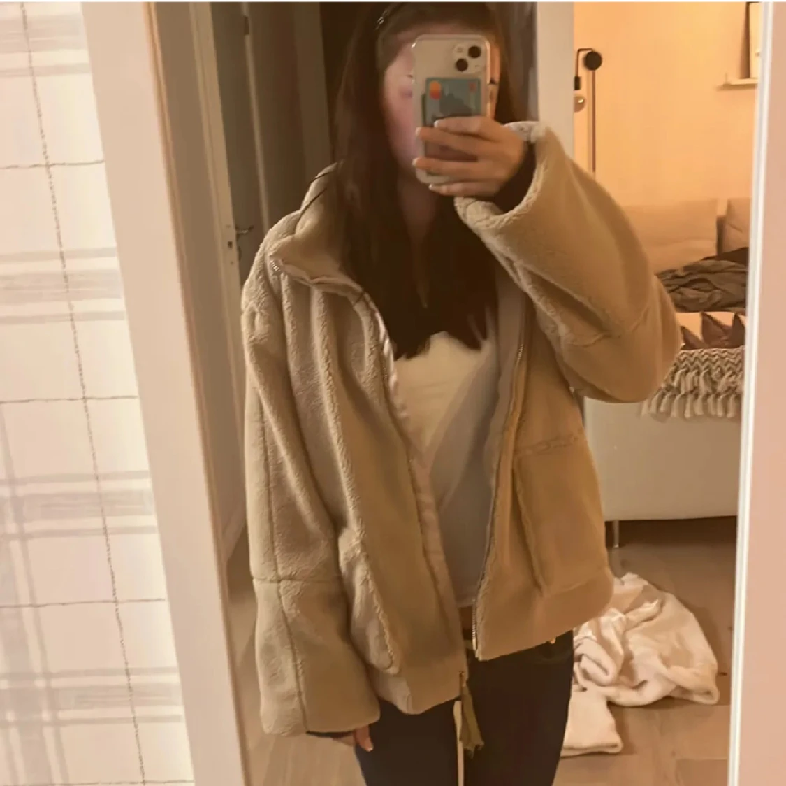 Mysig beige teddyjacka med dragkedja framtill. Jackan har en avslappnad passform och långa ärmar, perfekt för kyligare dagar. Den fluffiga texturen ger en trendig look.jääte fin🥰