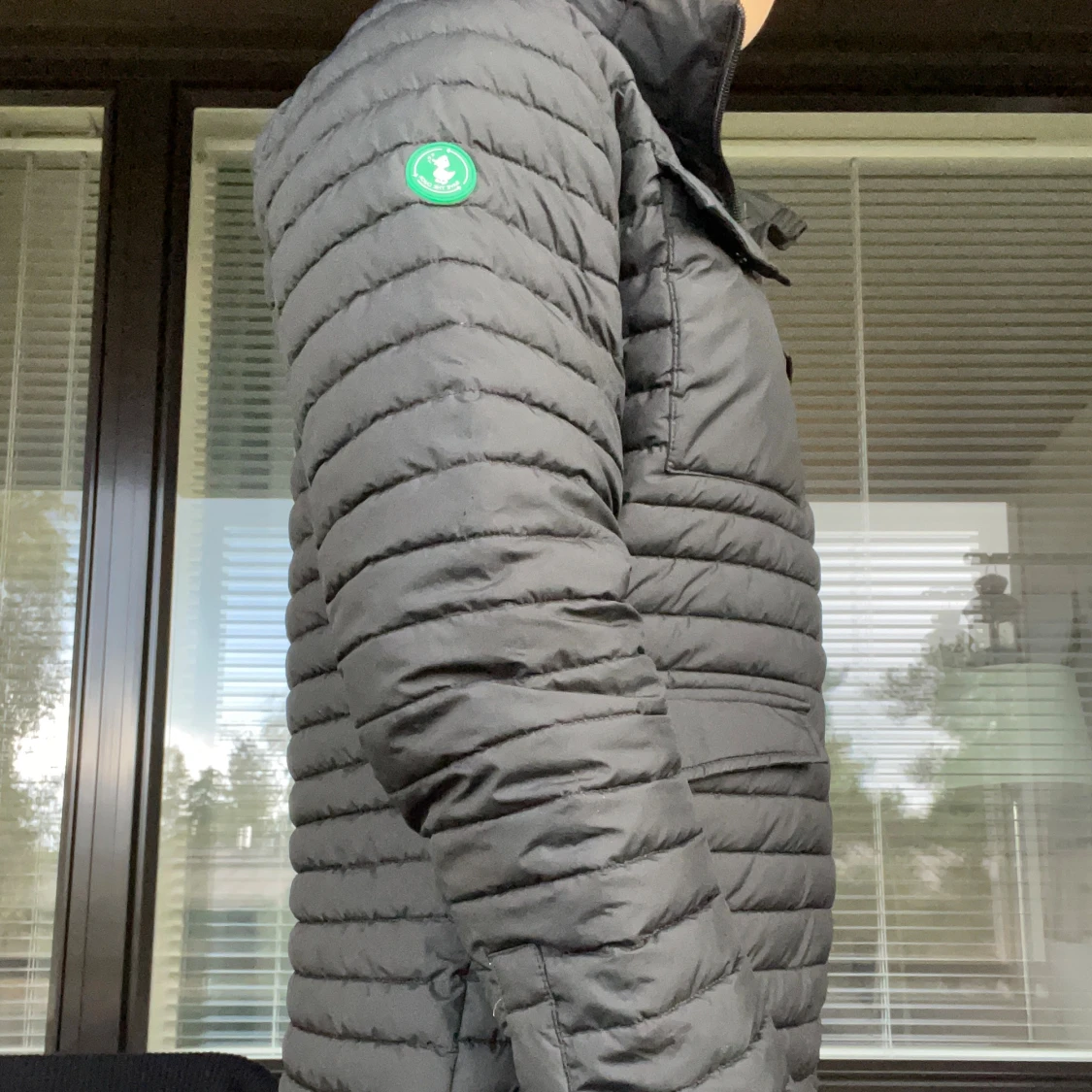 Säljer en svart dunjacka från Save the Duck med grönt logomärke på ärmen. Jackan har quiltad design, dragkedja med gröna detaljer och flera fickor framtill. Perfekt för dig som vill ha en lätt och snygg jacka med modern look.