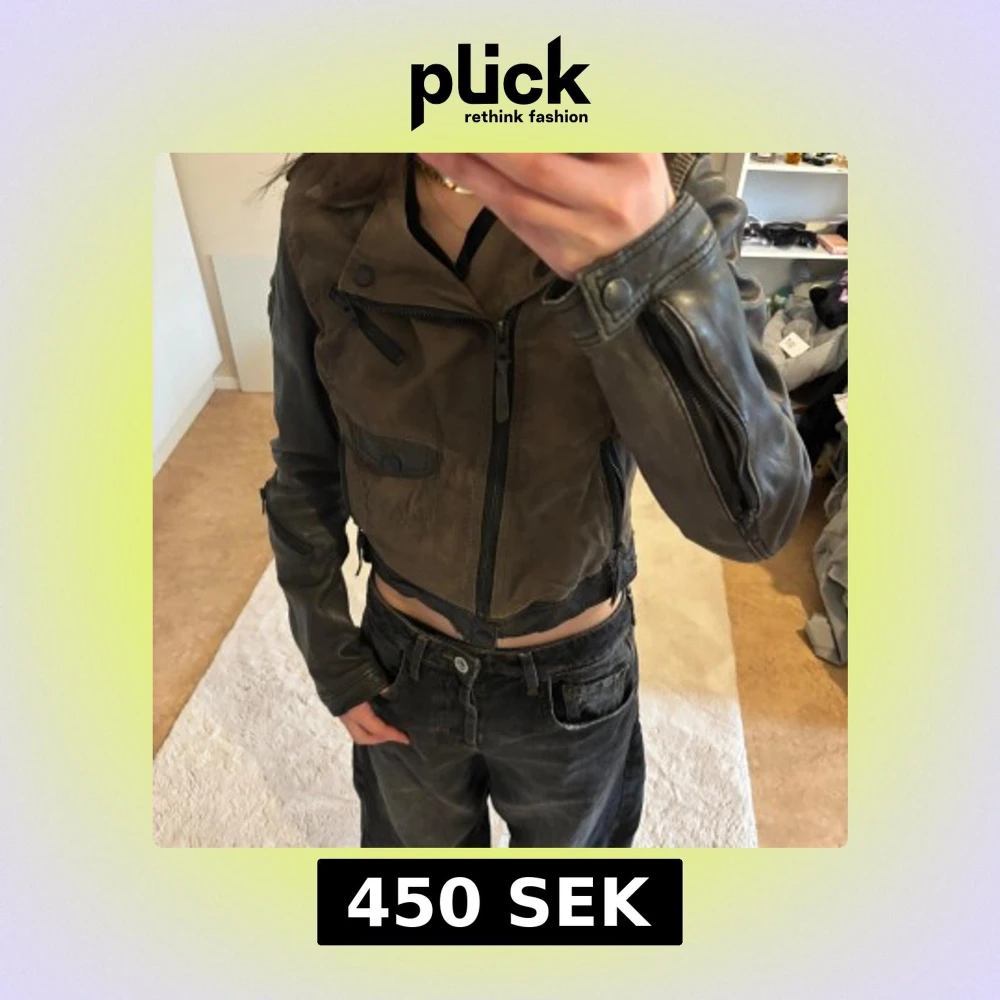 Säljer en cool brun och svart skinnjacka från Tigha. Jackan har en asymmetrisk dragkedja och flera fickor med dragkedjor. Den har långa ärmar och en stilren design med detaljer som knappar på axlarna.