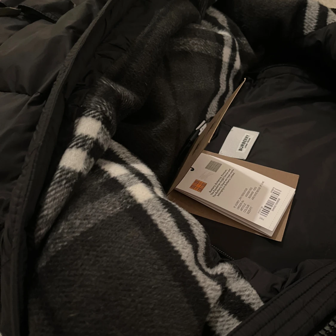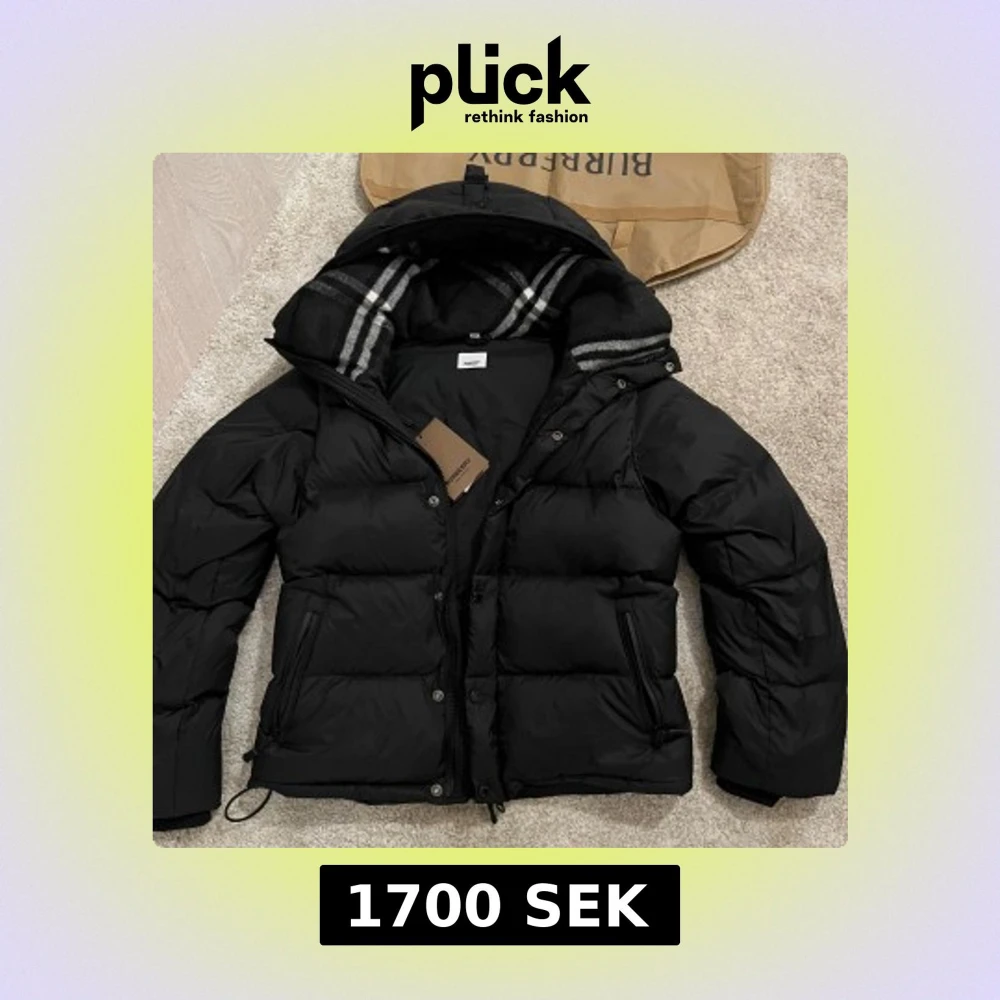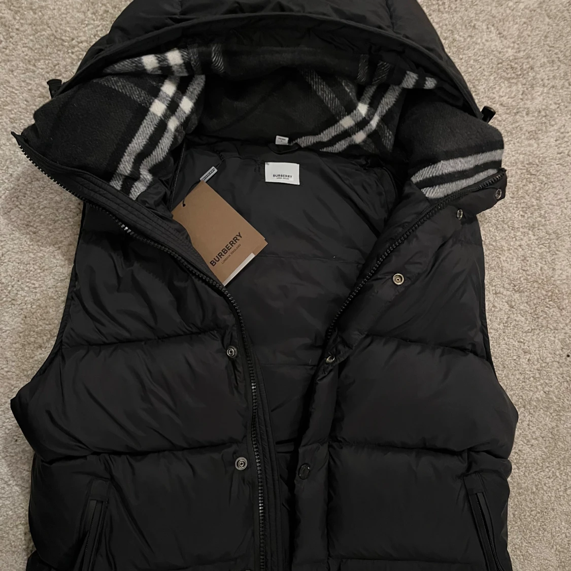 Svart pufferjacka från Burberry med avtagbara ärmar så den kan användas som väst. Jackan har huva med klassiskt rutigt Burberry-foder i svart och vitt, dragkedja och knappar framtill samt två sidofickor med dragkedja. Perfekt för kalla dagar och har en riktigt snygg streetstil. Jag säljer för billigare för den är för stor för mig. Har aldrig använts bara provats