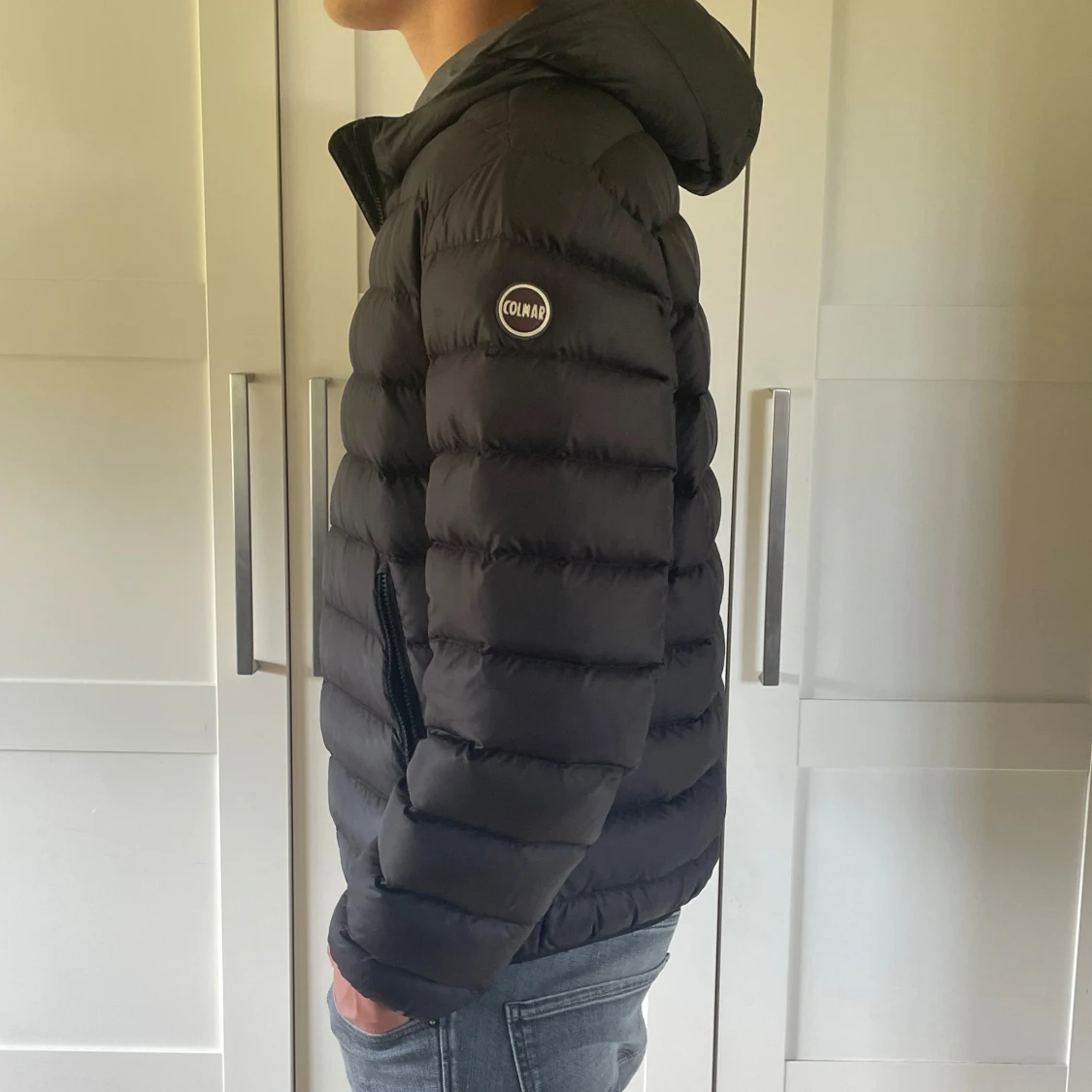 Tja! Säljer nu min svarta vinterjacka från Colmar med huva och snygga horisontella kanaler. Den är i storlek 50 som är Medium! Jackan har dragkedja framtill och två sidofickor med dragkedja. loggan är på vänster ärm. Den är perfekt för dig som vill ha en stilren och varm jacka med modern look perfekt till hösten och vintern!