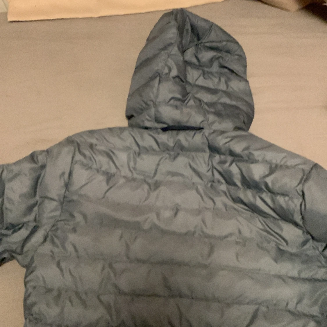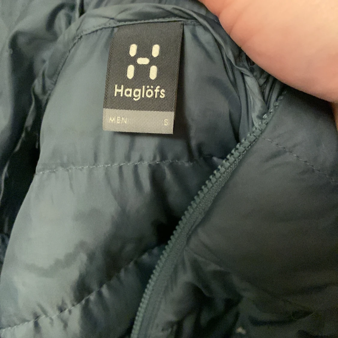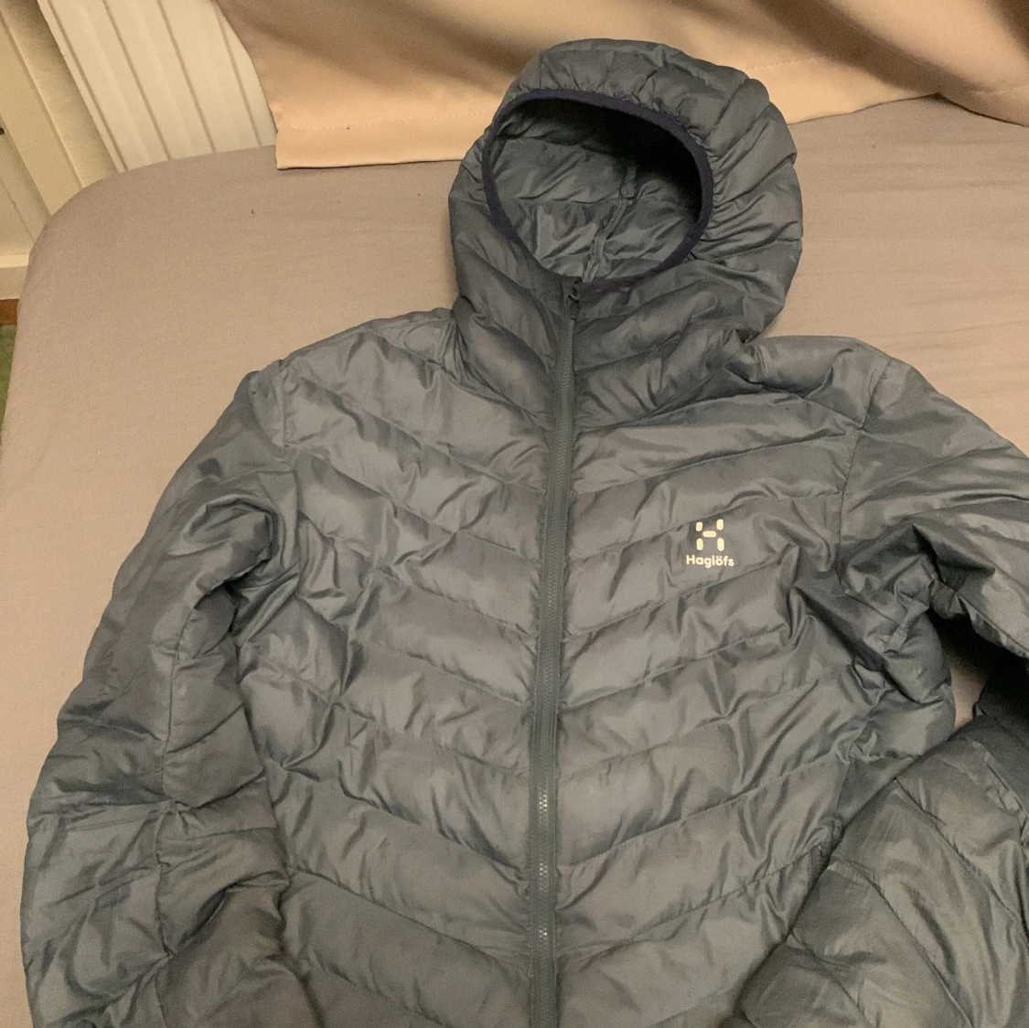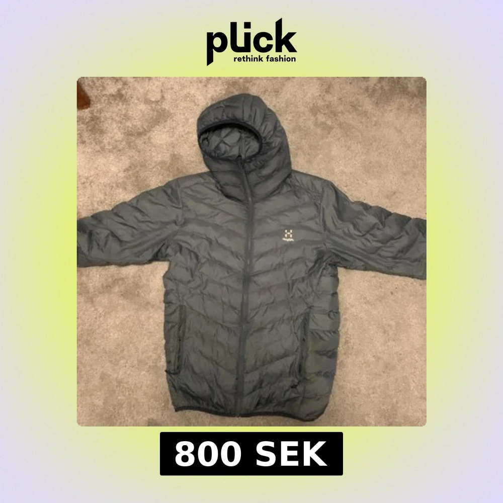 Säljer en grå dunjacka från Haglöfs med huva och dragkedja. Jackan är perfekt för kyligare väder och har en stilren design. Den är lätt och smidig att bära med sig. Passar bra för utomhusaktiviteter.