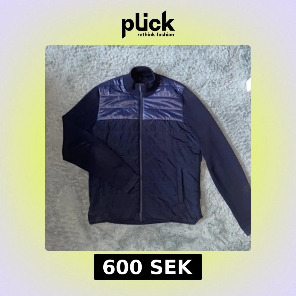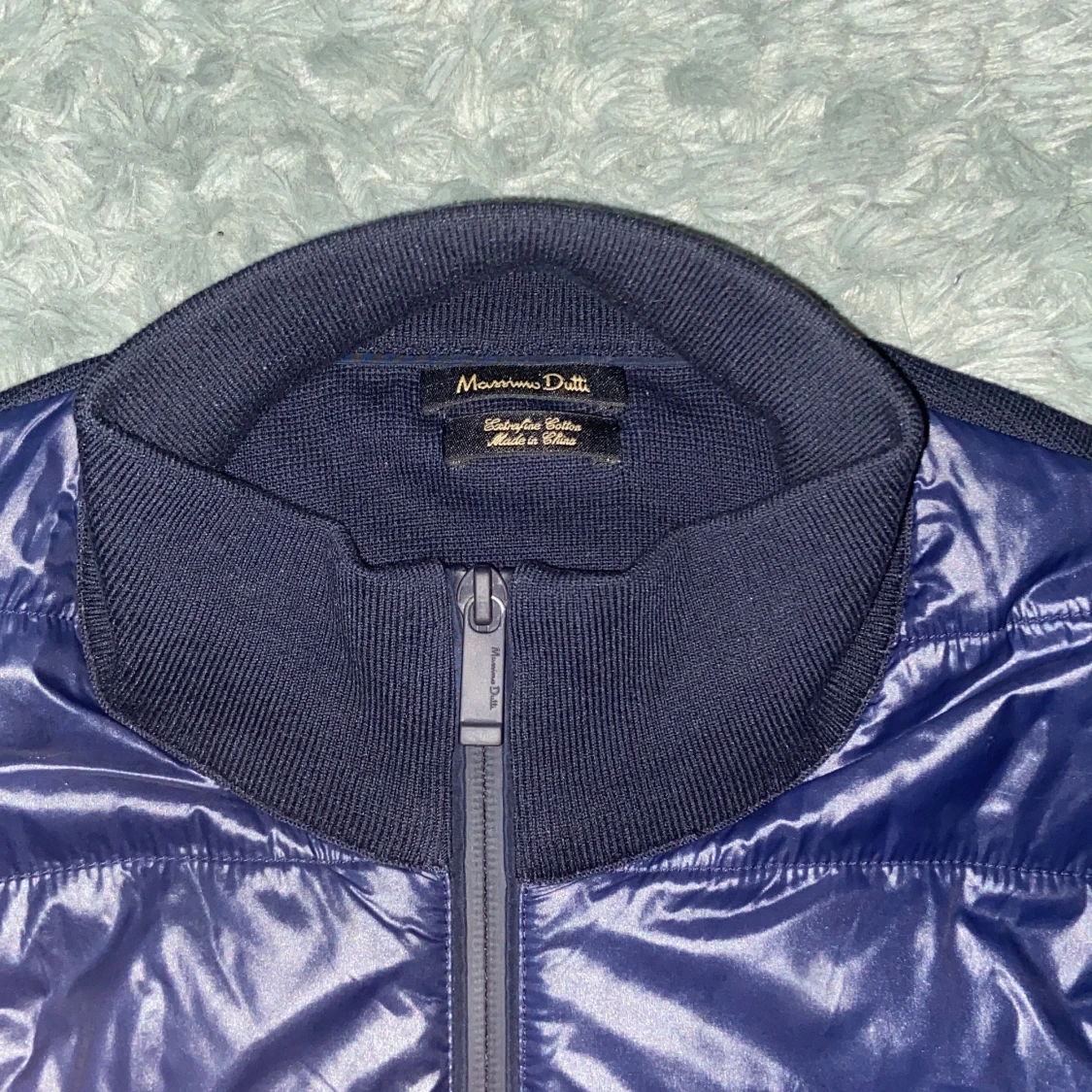 Snygg marinblå jacka från Massimo Dutti med glansiga paneler upptill och ribbad krage. Jackan har dragkedja framtill och två fickor.
