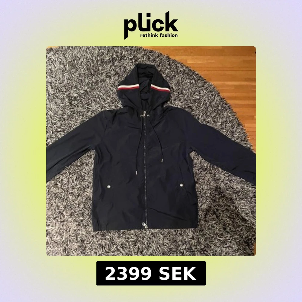 Snygg svart vindjacka från Moncler med huva och dragkedja. Jackan har långa ärmar och en stilren design med Moncler-logga på ärmen. Perfekt för blåsiga dagar. Byter gärna!!