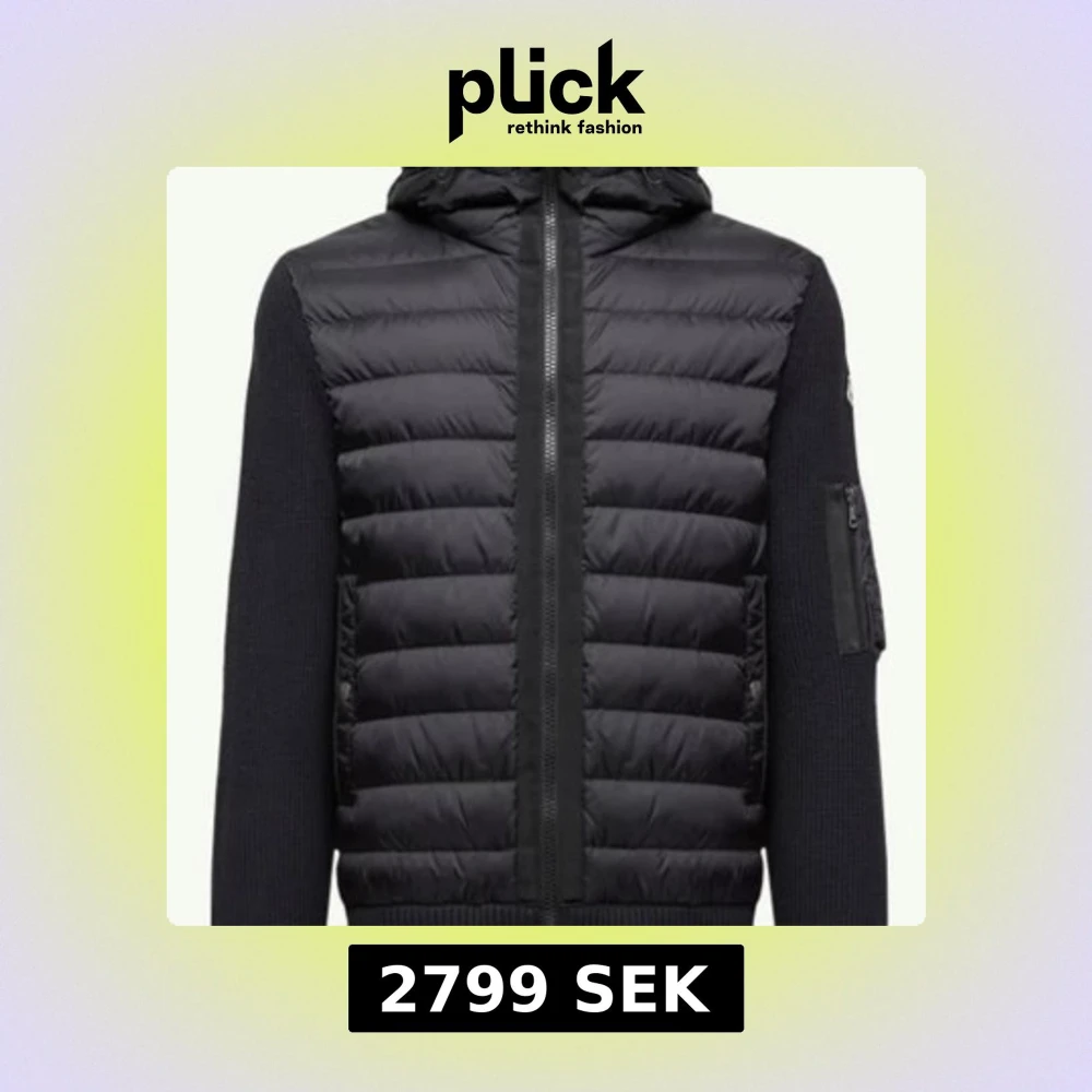 Svart pufferjacka från Moncler med quiltad front i dun och stickade ärmar. Jackan har huva, dragkedja framtill och en extra ficka med dragkedja på ärmen. Klassisk Moncler-logga på vänster ärm. Perfekt för dig som vill ha en clean och modern look.