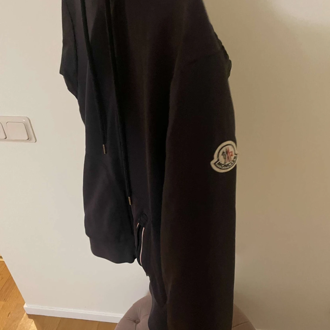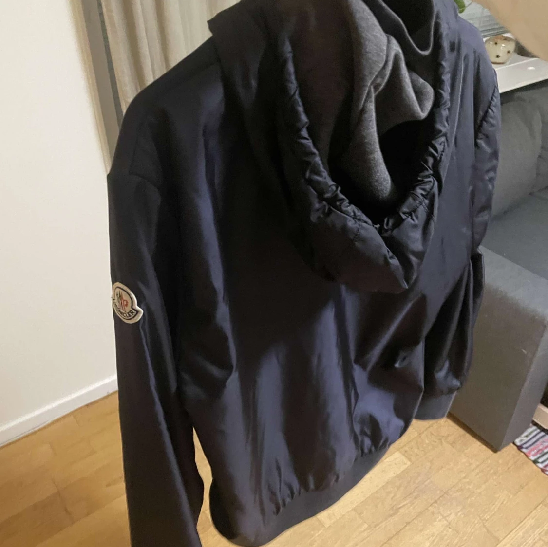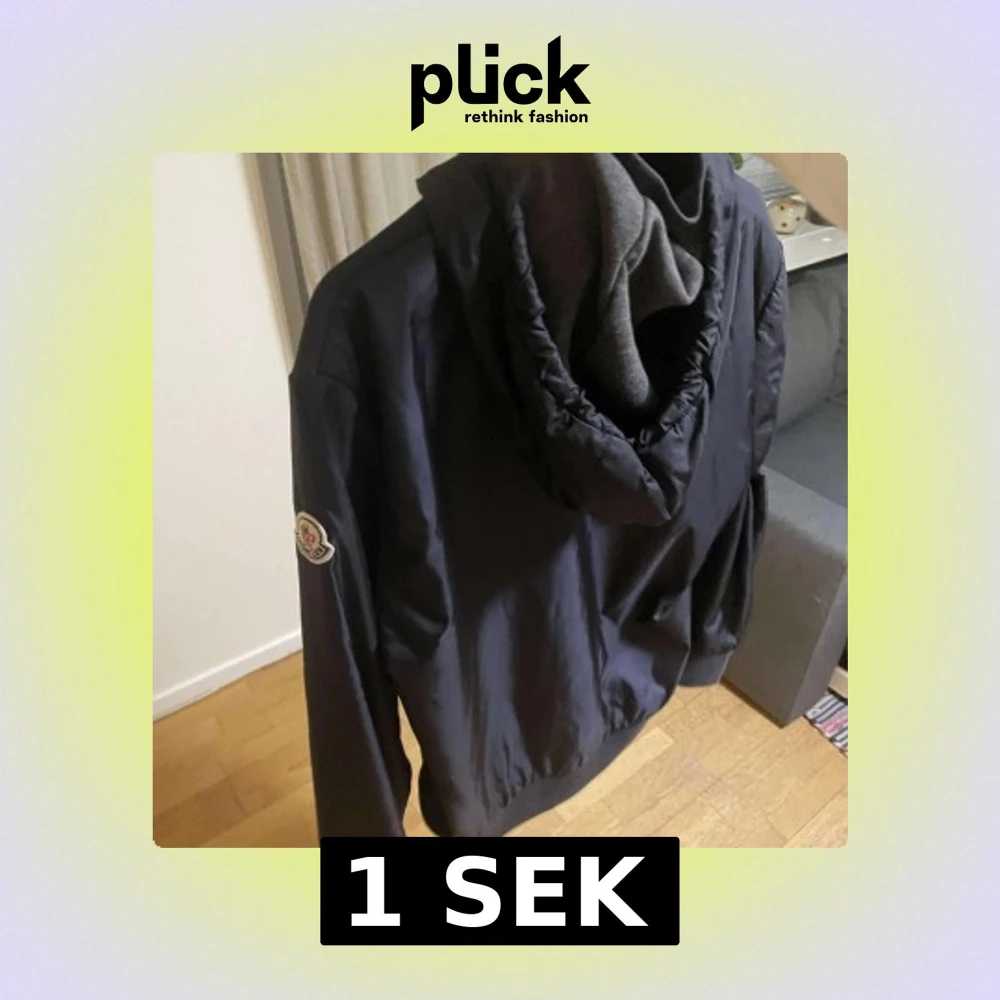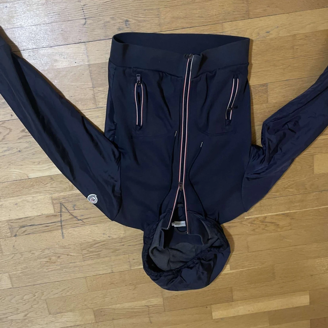Svart moncler cardigan med koft och windbreaker material. Storlek M. Kom med bud
