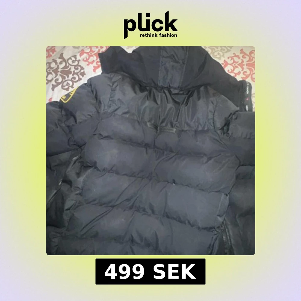 Säljer en svart pufferjacka från Zavetti Canada med en broderad logga på ärmen. Jackan har en dragkedja framtill och är perfekt för kalla dagar. Den har en hög krage och är långärmad för extra värme.