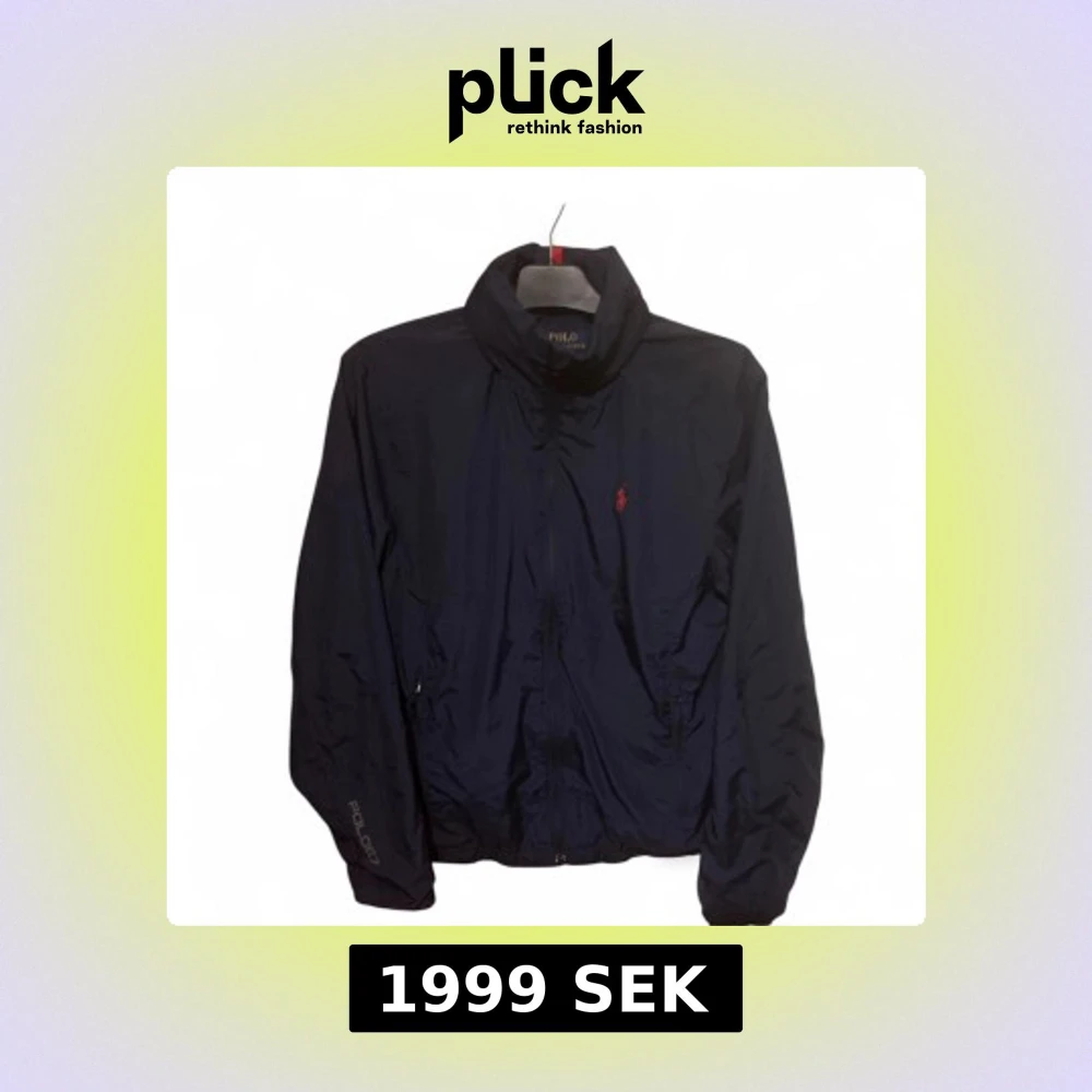 Snygg mörkblå vindjacka från Polo Ralph Lauren med röd logga på bröstet och diskreta röda detaljer vid dragkedjorna. Jackan har huva, hög krage och elastisk nederkant. Materialet är lätt och syntetiskt, perfekt för blåsiga dagar. Klassisk och sportig look.