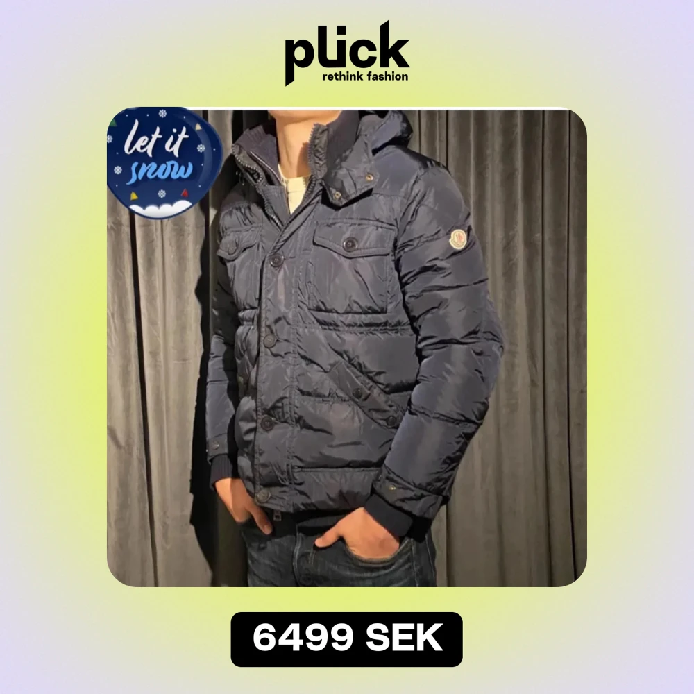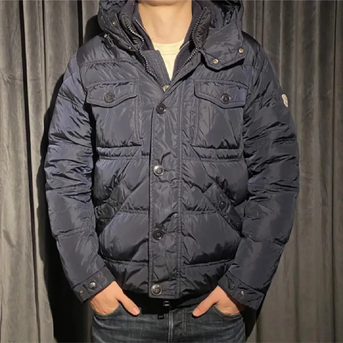Säljer en snygg mörkblå pufferjacka från Moncler. Jackan har en praktisk huva och stängs med både dragkedja och knappar. Perfekt för kalla vinterdagar! Skick 8/10 storlek 3