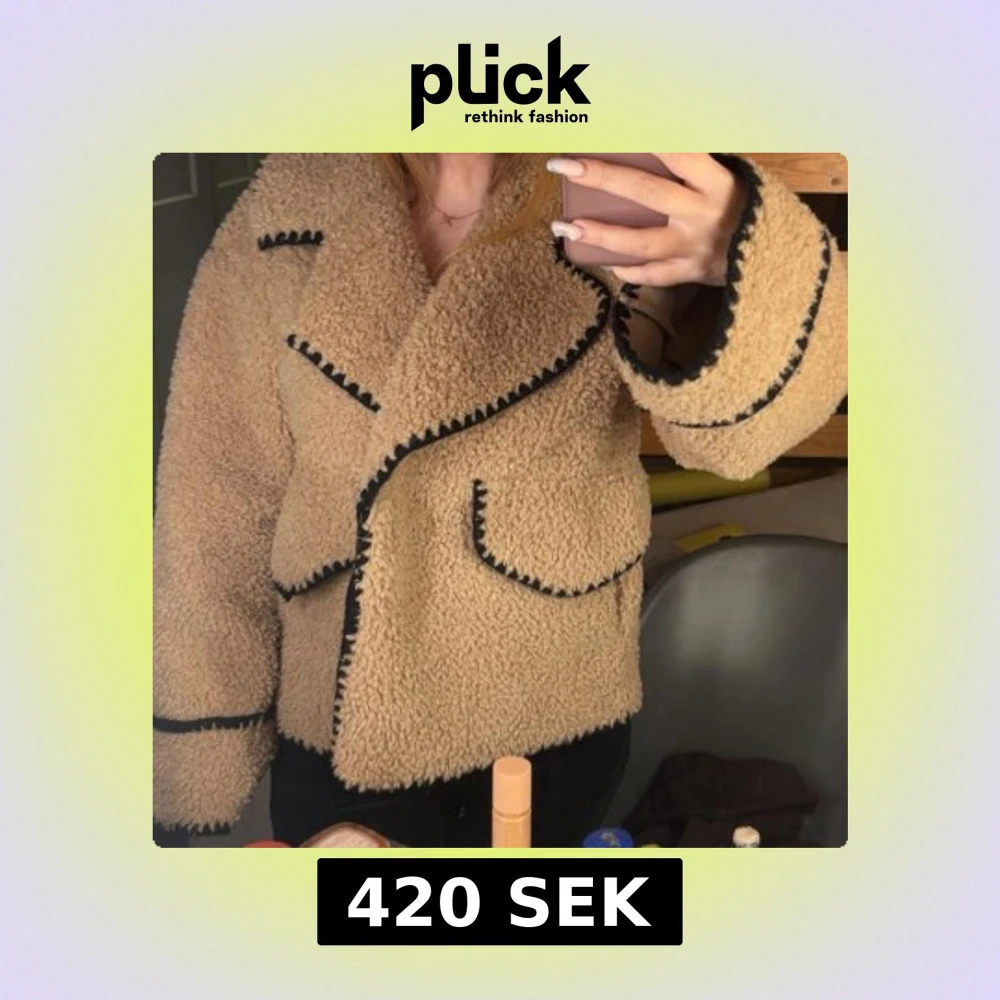 Supermysig beige teddyjacka med markerade svarta sömmar och stora slag. Jackan har två fickor framtill och en oversized passform. Perfekt för kalla dagar när du vill vara både varm och snygg. Köptes för 1299kr från object