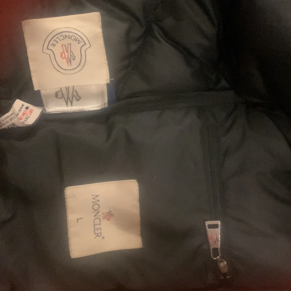 Säljer en svart dunjacka från Moncler i storlek L. Jackan har klassisk quiltad design, dragkedja framtill och ikoniska Moncler-loggan på bröstet. Insidan har den typiska serieteckningen. Perfekt för kalla dagar och riktigt snygg streetstil. Dragkedjan är lite sönder