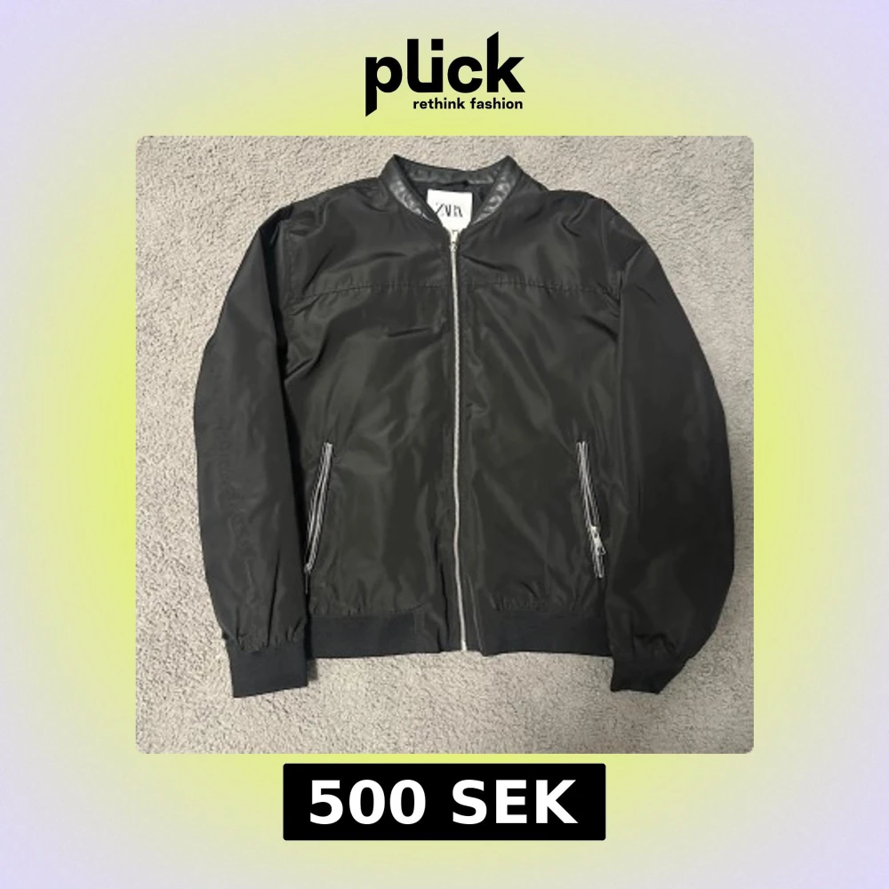 Svart bomberjacka från Zara med klassisk ribbad mudd i ärmslut och nederkant. Jackan har dragkedja framtill, två snedställda fickor med dragkedja och en stilren, minimalistisk look. Materialet är blankt och lätt, perfekt för en clean streetstyle.