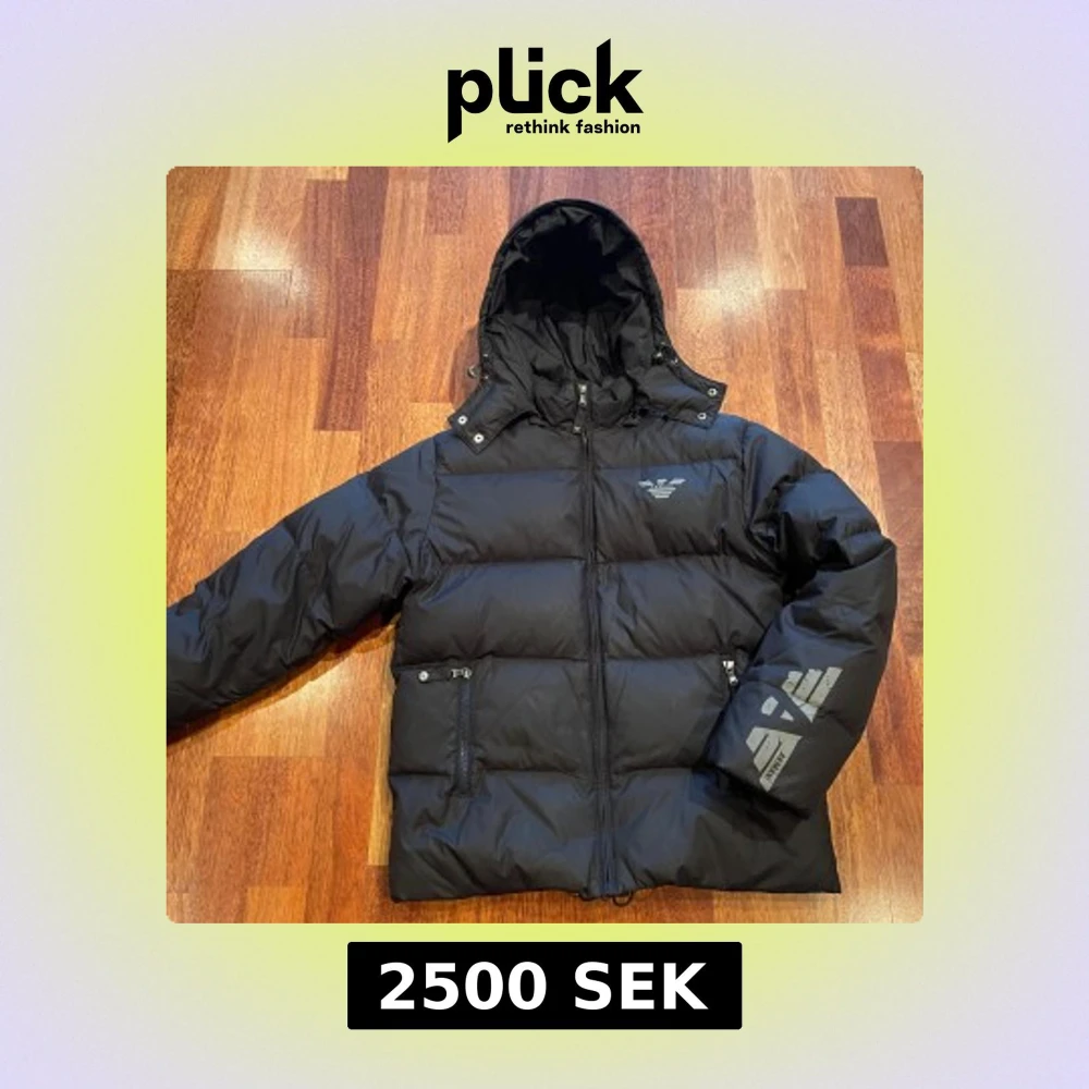 Säljer en snygg svart dunjacka från Armani Teen. Jackan har en huva och dragkedja framtill. Den är dekorerad med det ikoniska Armani-logotypen på bröstet och ärmen. Perfekt för kalla dagar med sin vadderade design. BUDA