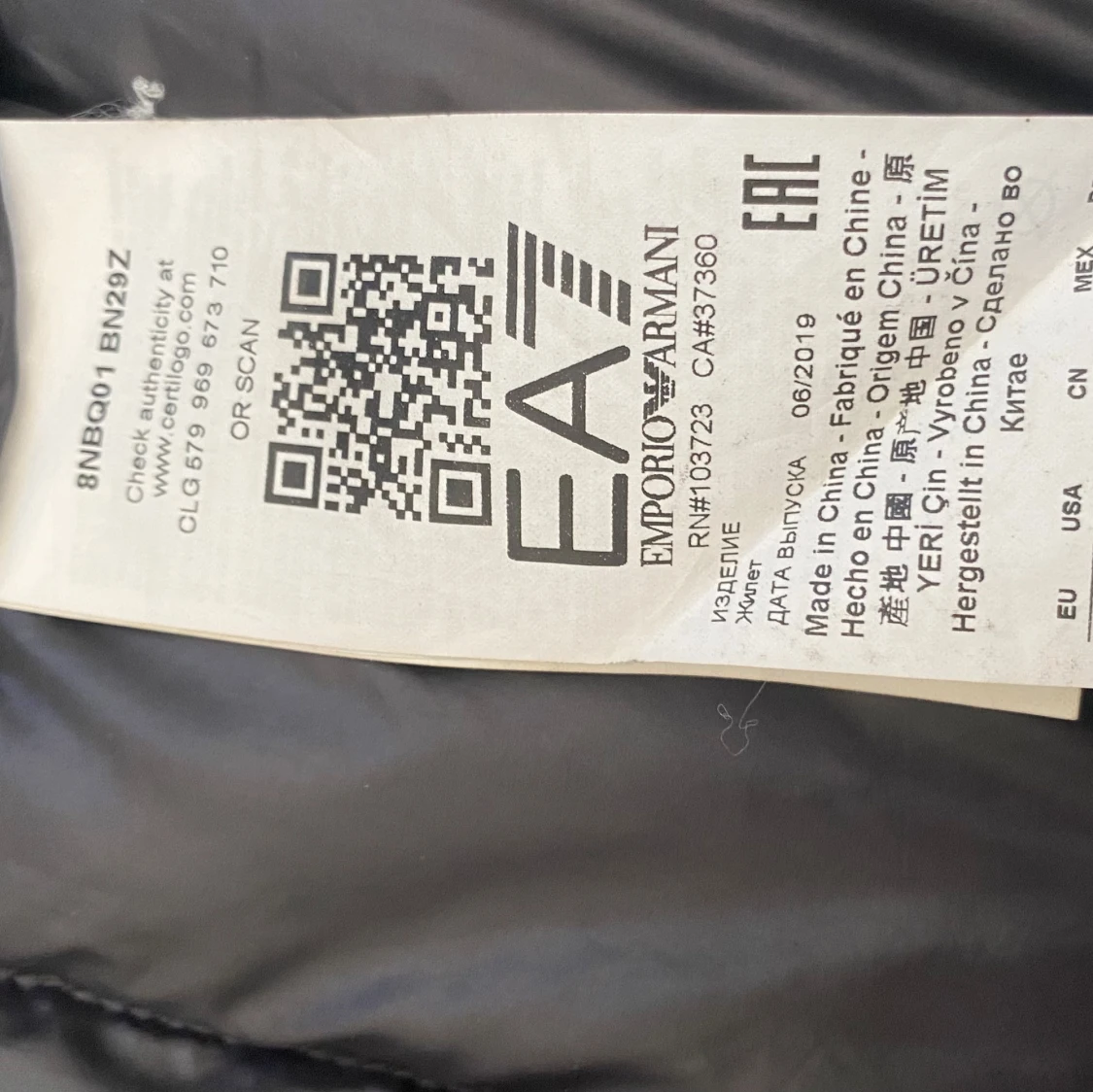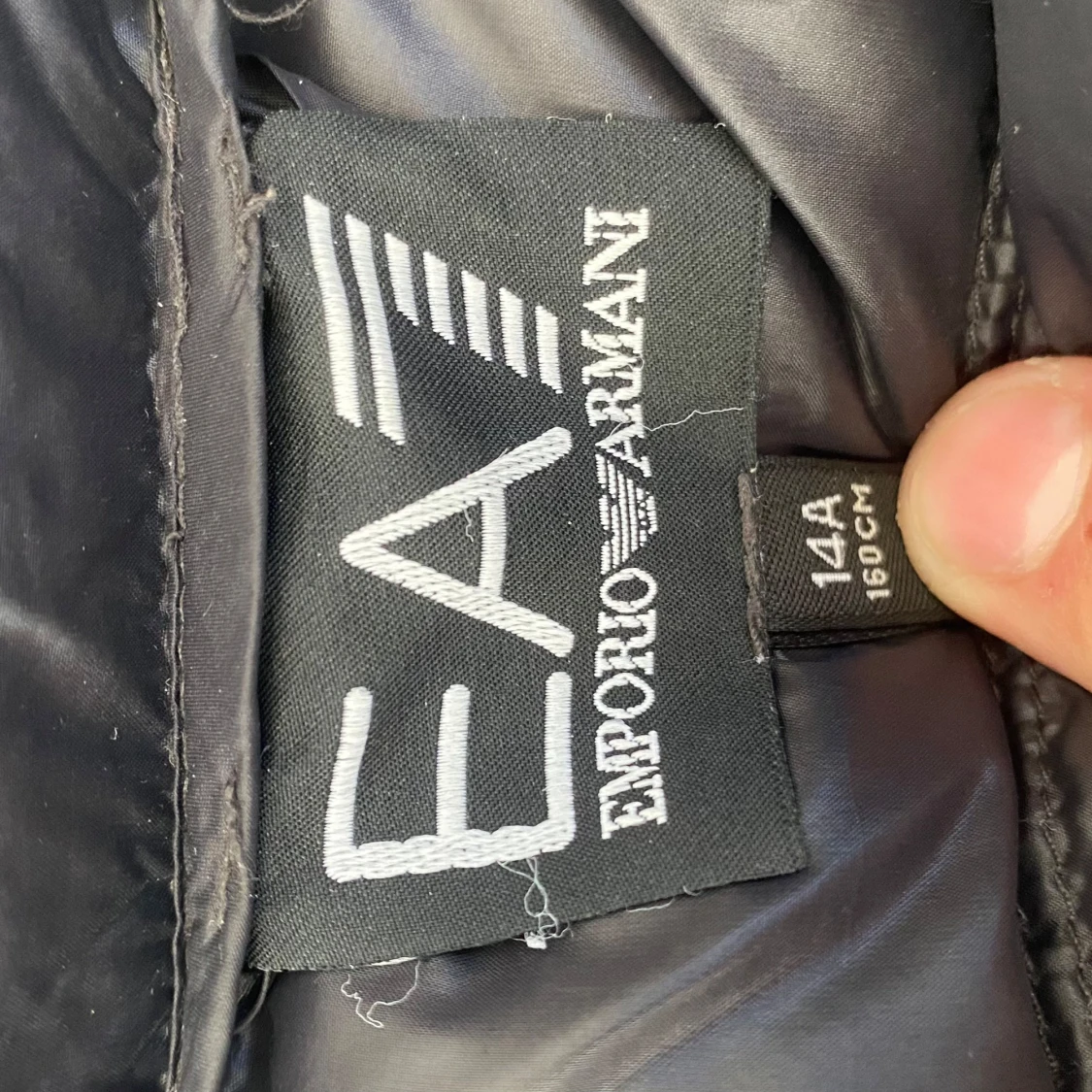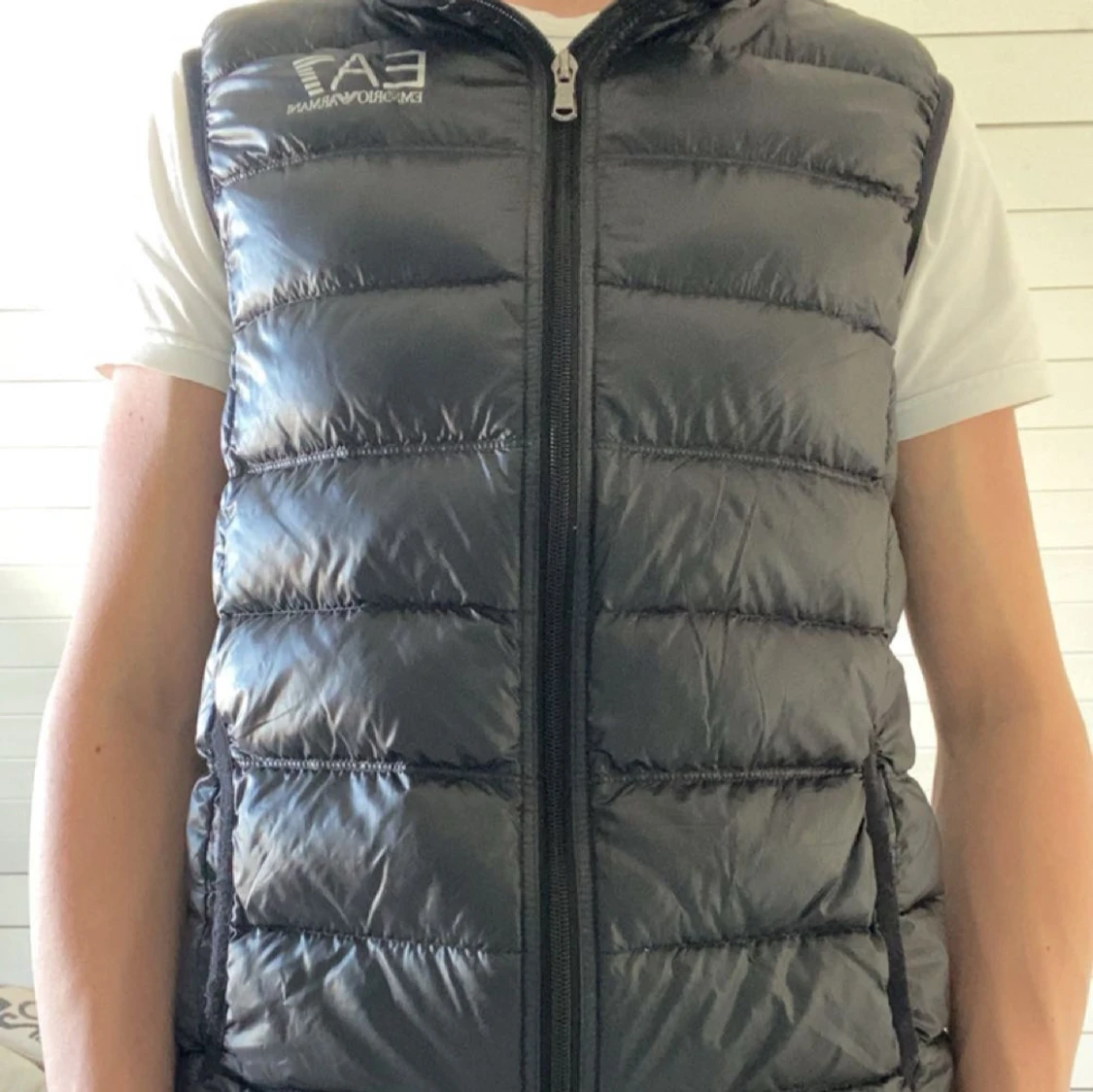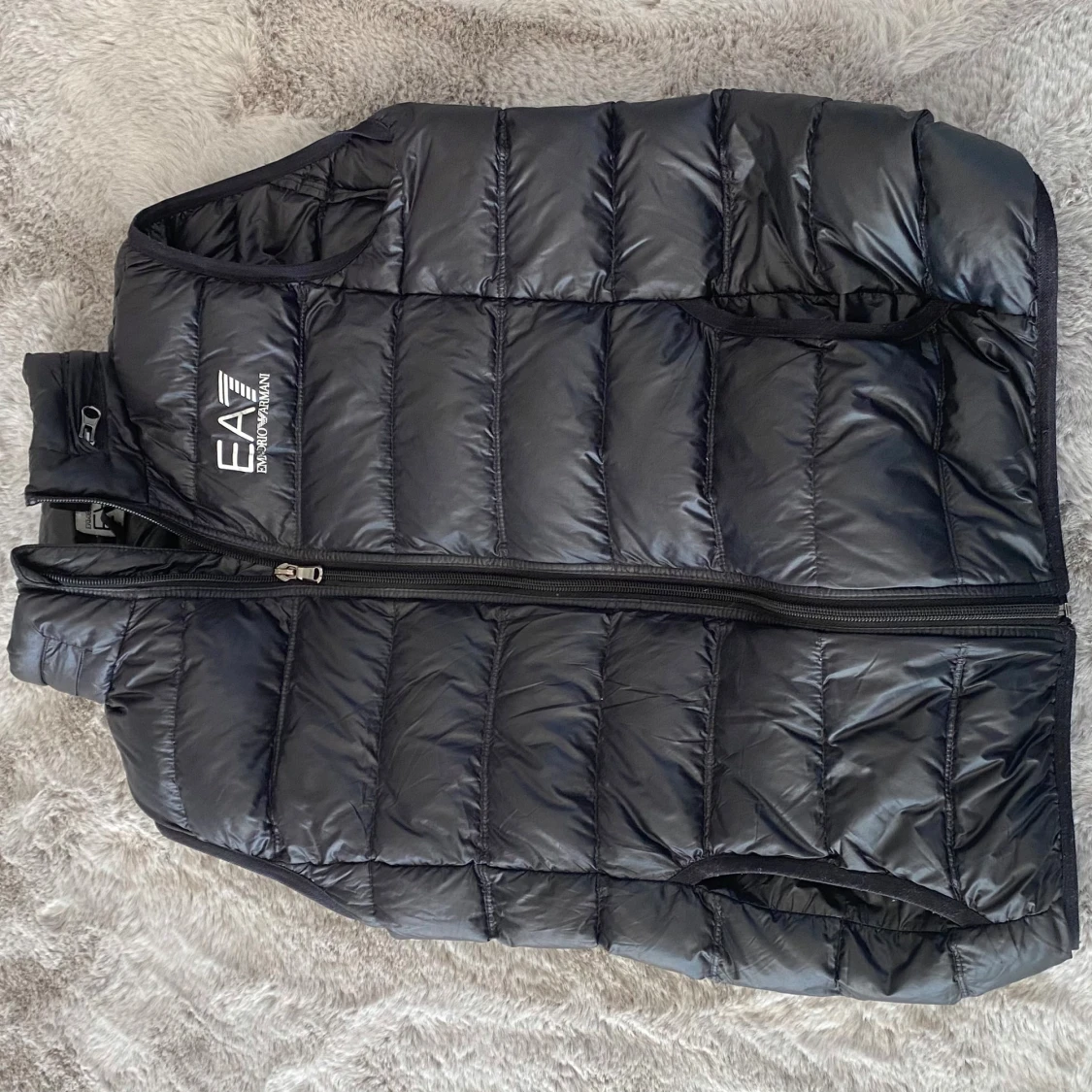 Säljer en svart dunväst från Emporio Armani EA7 med quiltad design och dragkedja framtill. Västen har en hög krage och två sidofickor med dragkedja. Perfekt för lager-på-lager och stilren look.