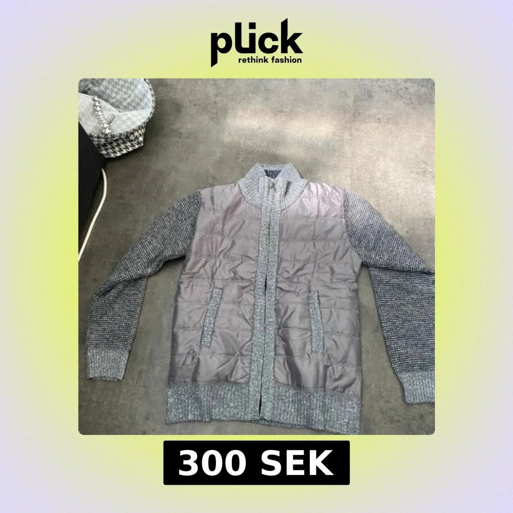 Snygg grå cardigan jacka med stickade ärmar och rygg samt quiltad front i blankt material. Jackan har hög krage, dragkedja och två fickor framtill. Perfekt för lager-på-lager och chill stil.