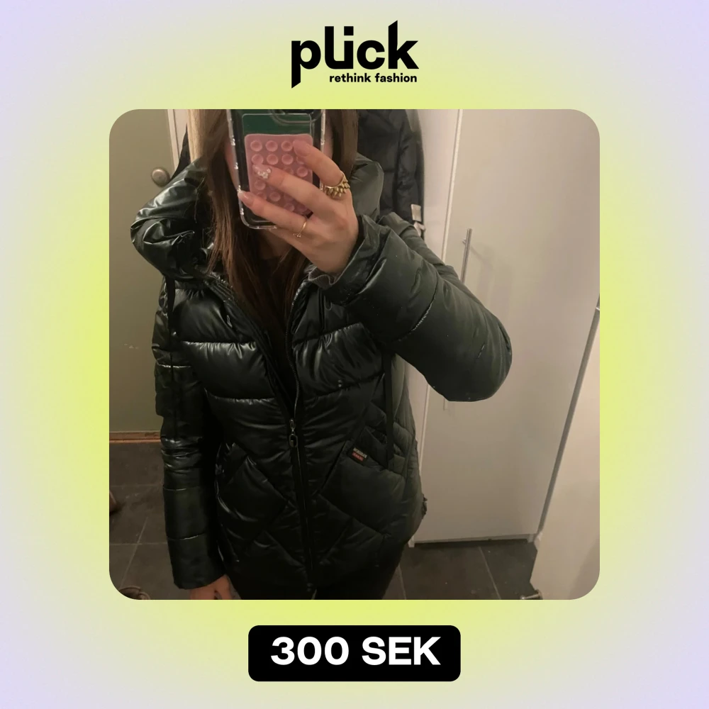 Snygg svart pufferjacka med huva och dragkedja. Perfekt för kyliga dagar med sin quiltade design som håller värmen. Jackan har långa ärmar och en stilren look. Stolek L men funkar för mig som är S