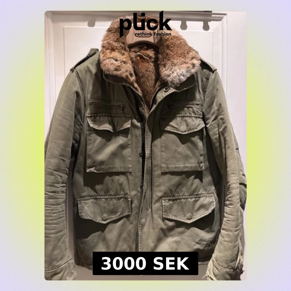 Säljer en olivgrön fieldjacka med stor, mjuk äkta kaninpäls på krage och insida. Jackan har fyra stora fickor framtill, axelklaffar och dragkedja. Perfekt för kalla dagar och ger en riktigt snygg och avslappnad look.