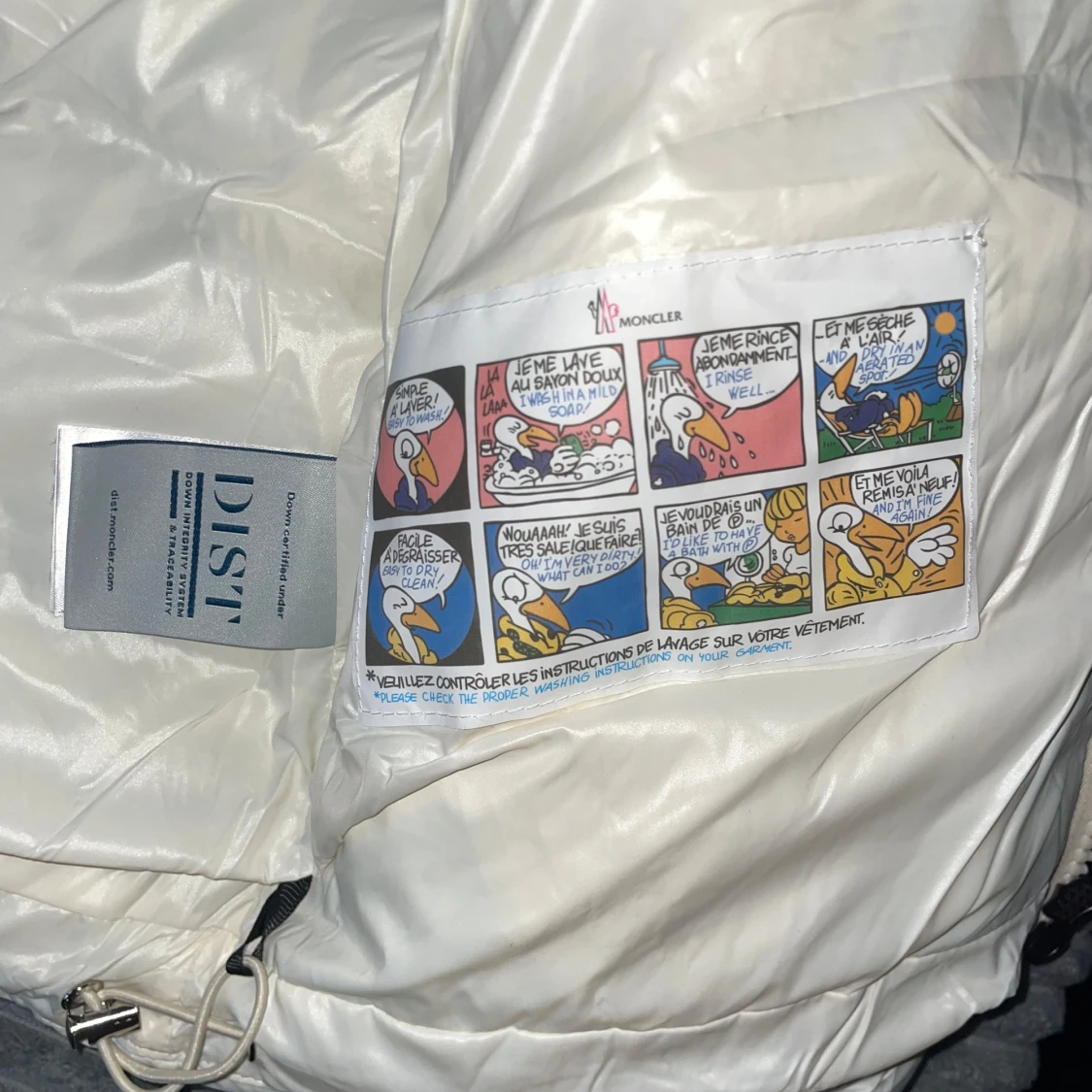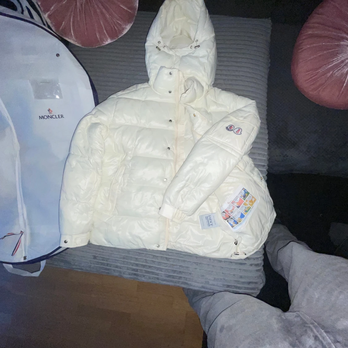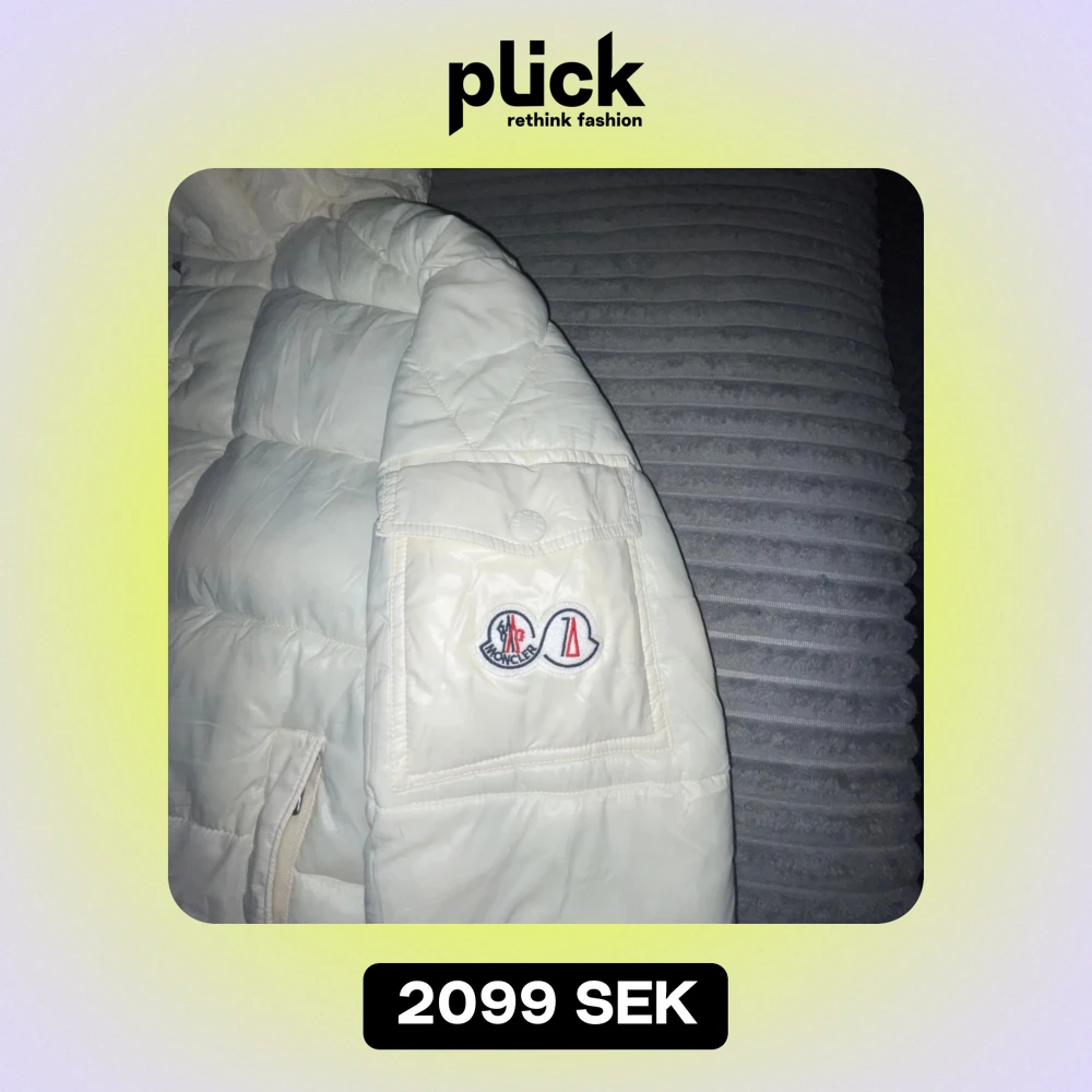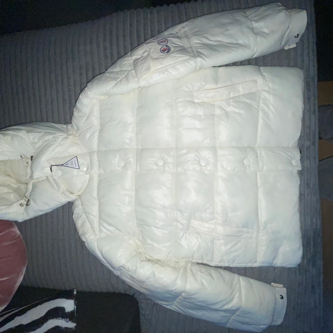 Säljer en moncler vit jacka i mycket bra skick. Jackan har en quiltad design med en huva och knappar framtill. Perfekt för kalla vinterdagar.
