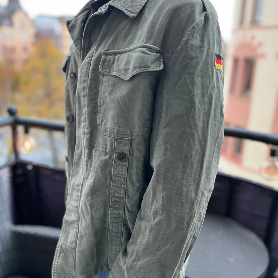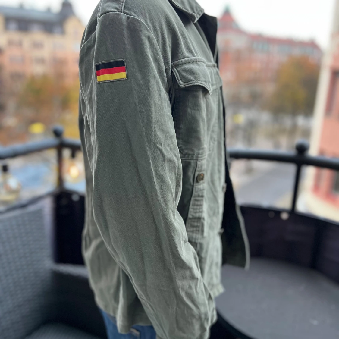 Säljer en grön militärinspirerad overshirt med tyska flaggan på ärmen. Jackan har två stora bröstfickor med lock och knappar. Jackan har avslappnad passform, perfekt att slänga över en hoodie eller t-shirt eller bara lager på lager nu till hösten.