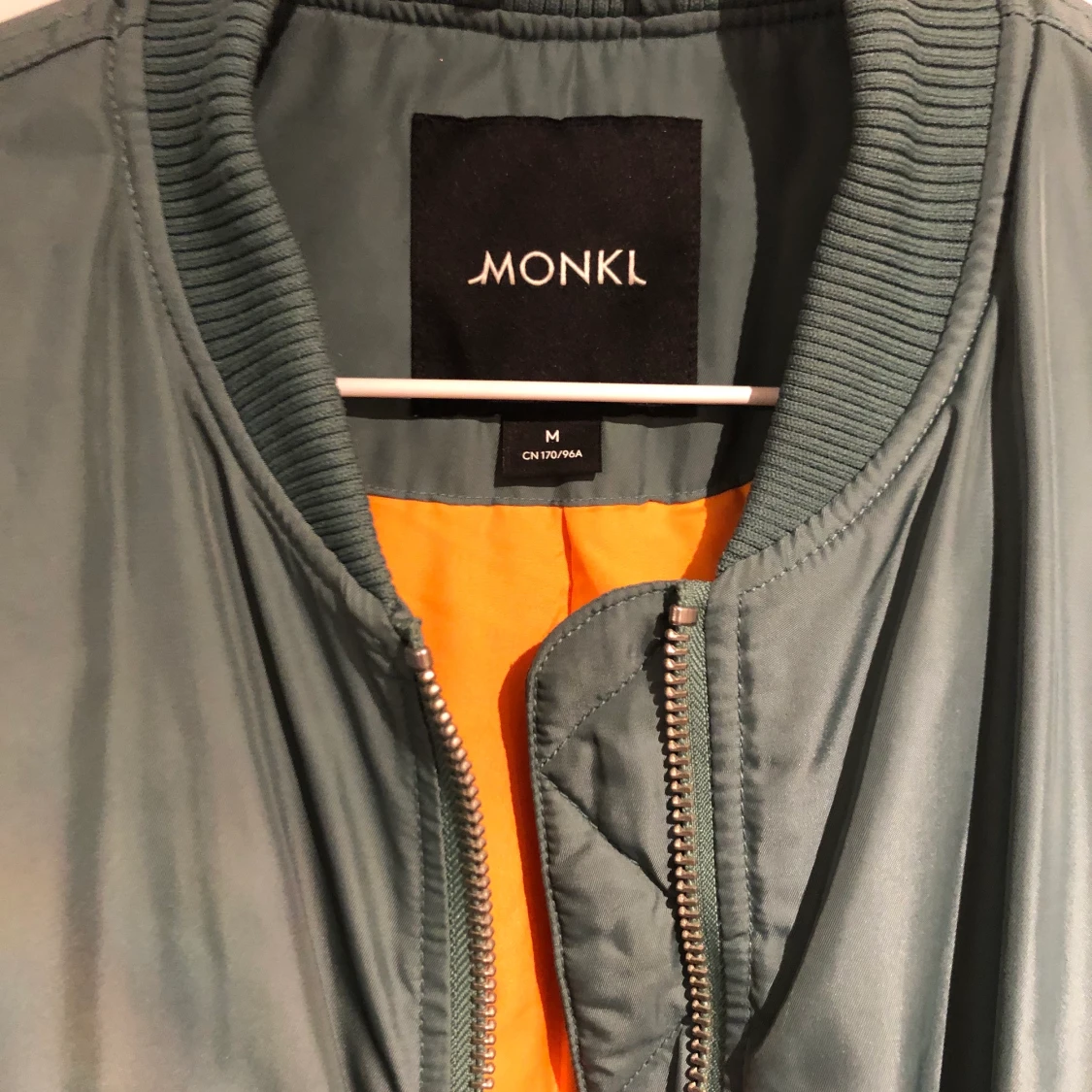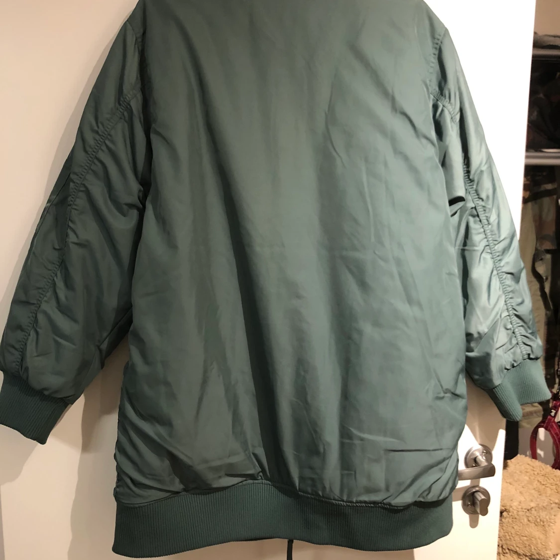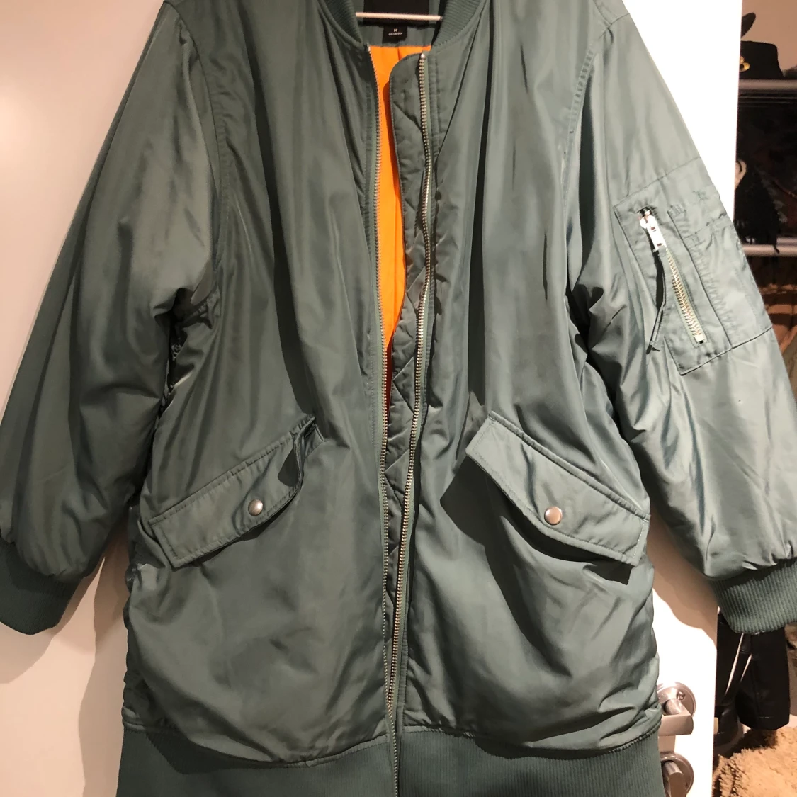 Lång bomberjacka som är använd sparsamt finns ett litet litet hål i ena armen