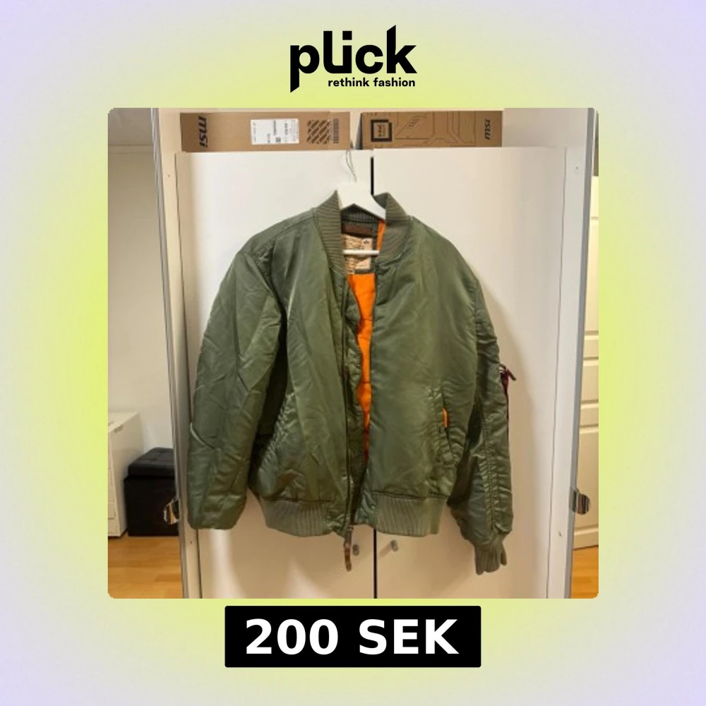 Säljer en klassisk grön bomberjacka från Alpha Industries med orange foder. Jackan har dragkedja framtill, ribbade muddar och är långärmad. Perfekt för dig som vill ha en streetig och tidlös look.