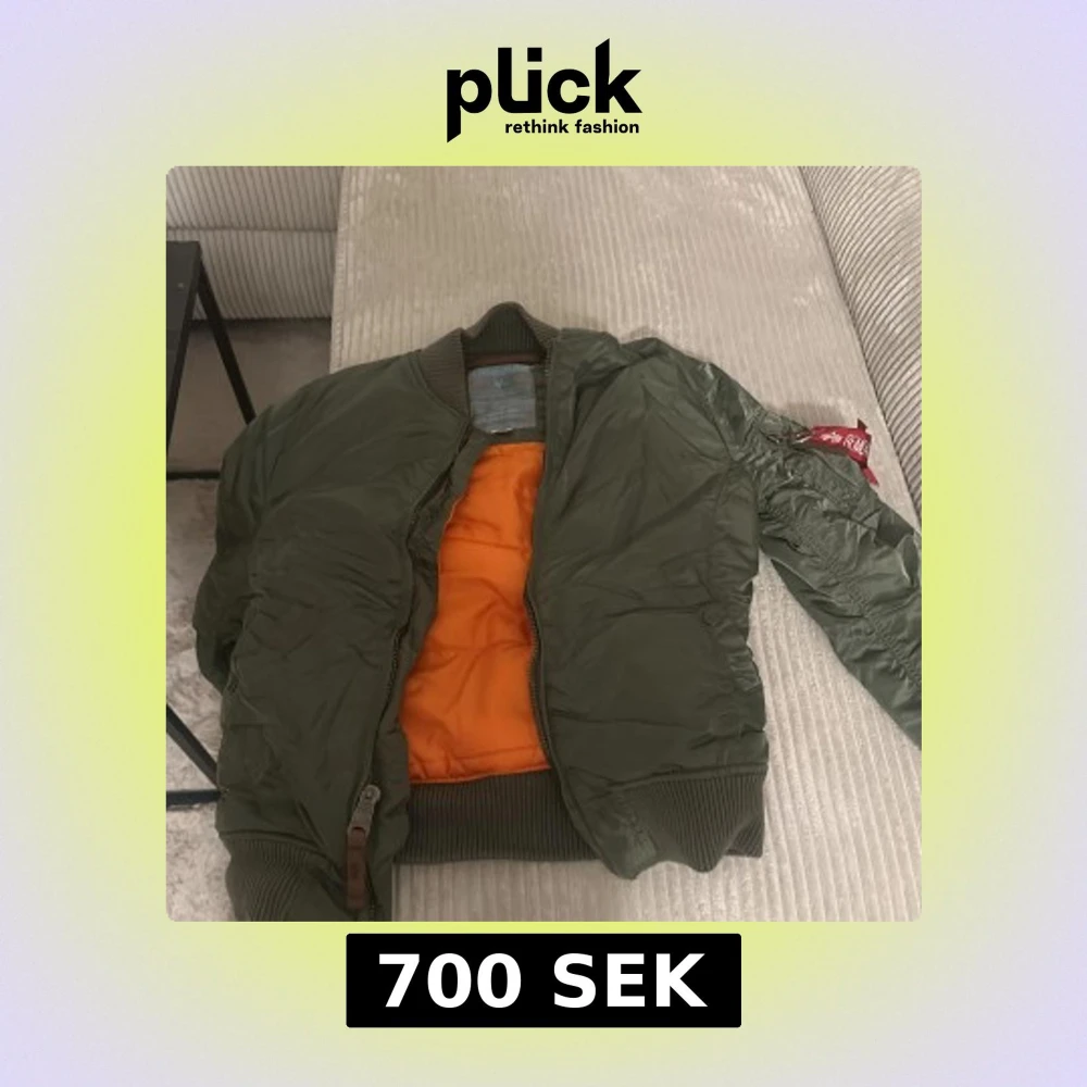 Säljer en klassisk grön bomberjacka från Alpha Industries med orange foder och ikonisk röd tag på ärmen. Jackan har dragkedja framtill, ribbade muddar och flera fickor. Perfekt för dig som vill ha en tidlös streetstil. både kvinnor o män kan ha på sig