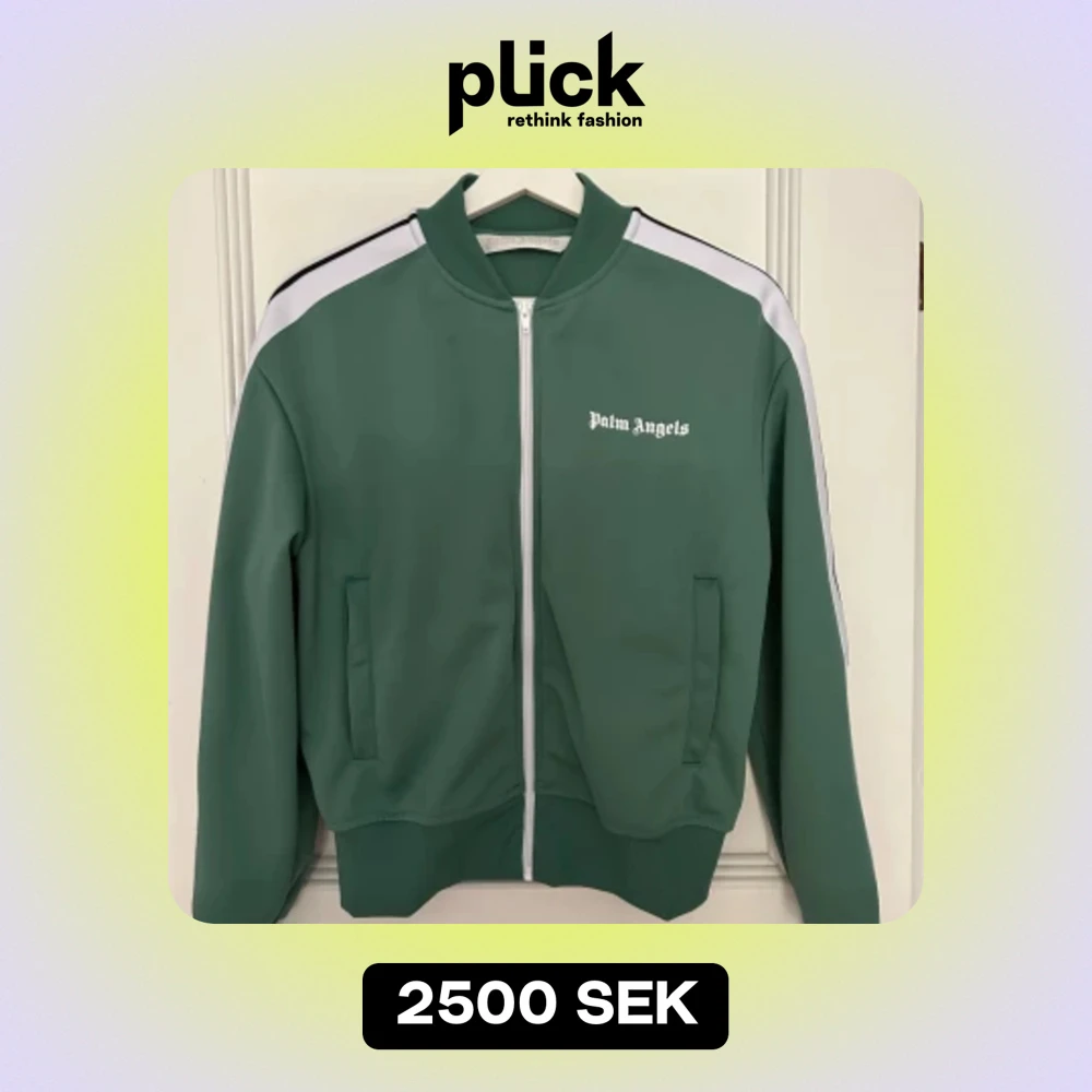 Säljer en snygg grön jacka/sweather från Palm Angels. Jackan har en vit dragkedja och vita detaljer längs ärmarna. Den är långärmad och har en normal passform. Perfekt för både vår och höst!