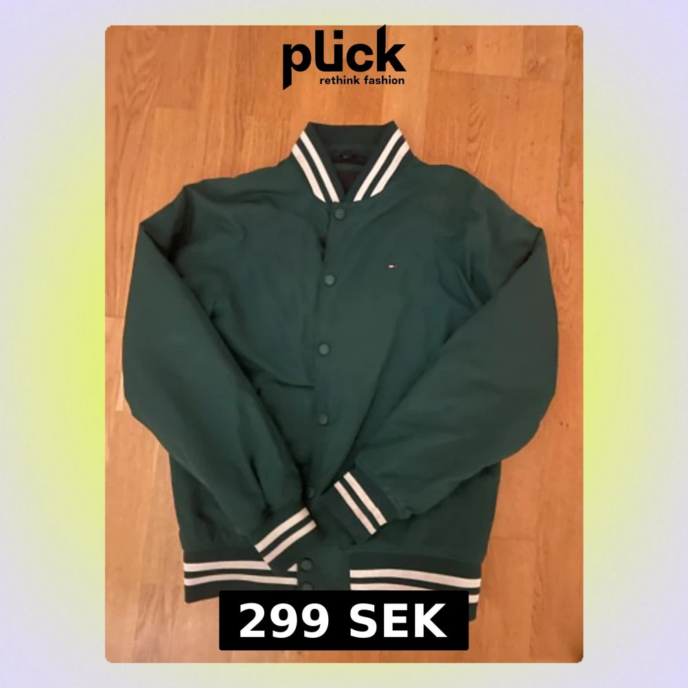 Snygg grön bomberjacka från Tommy Hilfiger med klassiska vita ränder på krage, ärmslut och midja. Jackan har tryckknappar framtill och diskret logga på bröstet. Perfekt för dig som vill ha en stilren och sportig look.