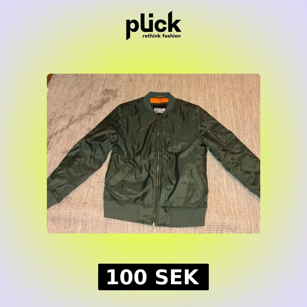 Snygg mörkgrön bomberjacka från Urban Classics i storlek XL. Jackan har orange foder, ribbade muddar och dragkedja framtill. Klassisk bomberstil med fickor och en extra ficka med dragkedja på ärmen. Perfekt för dig som gillar streetwear. Strlk XL men passar L bättre.
