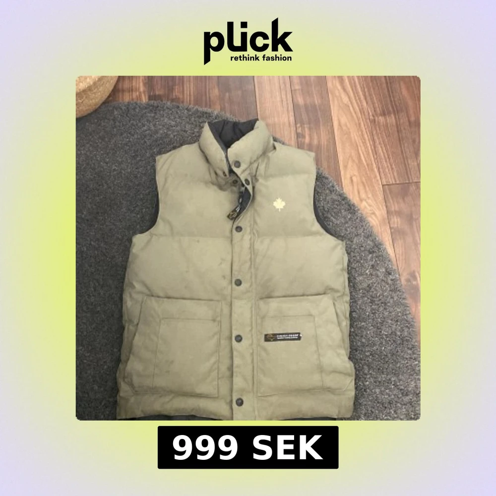 Säljer en olivgrön dunväst från Canada Goose med hög krage och stora fickor framtill. Västen har en diskret logga med lönnlöv på bröstet och svarta tryckknappar. Perfekt för kalla dagar och har en clean, klassisk look.