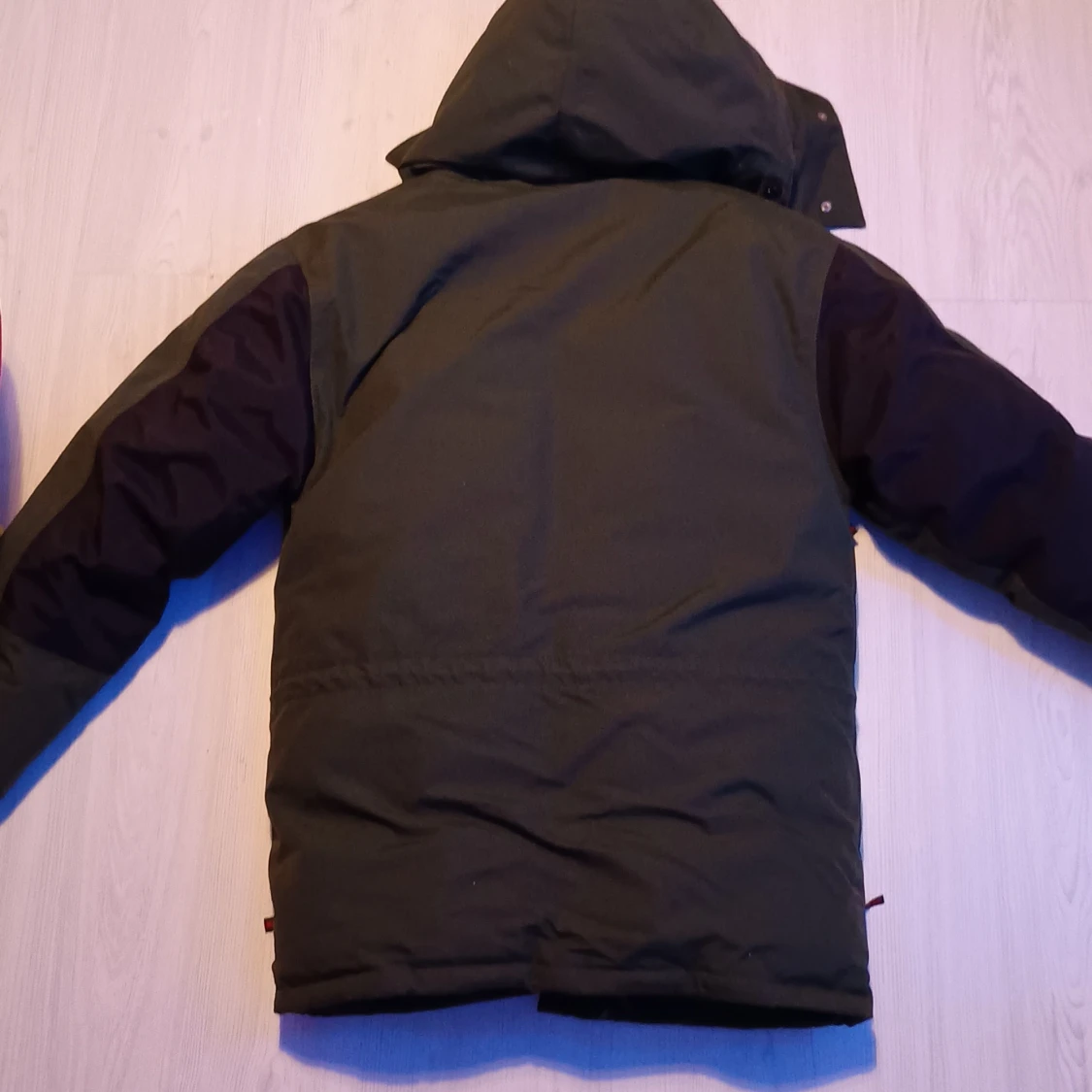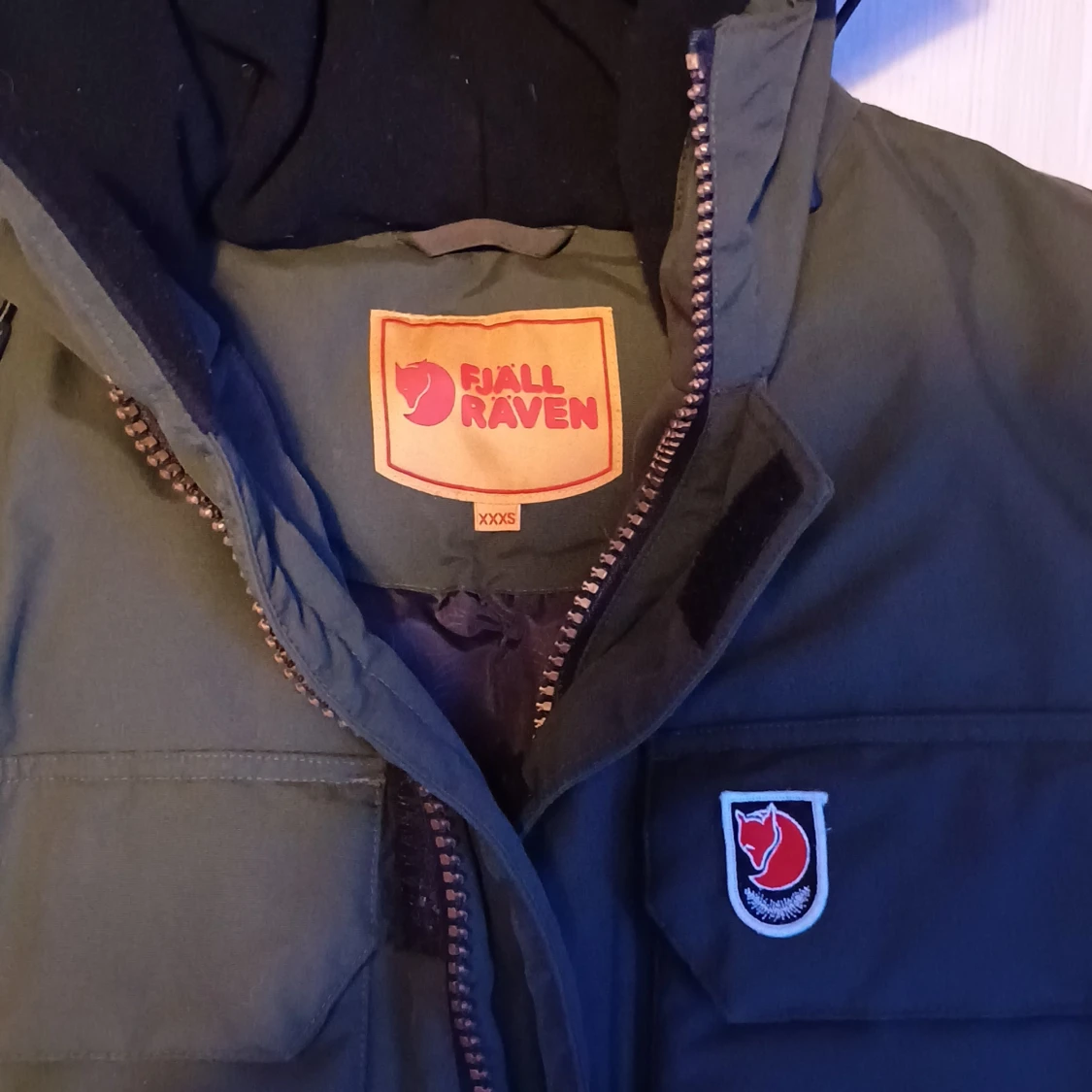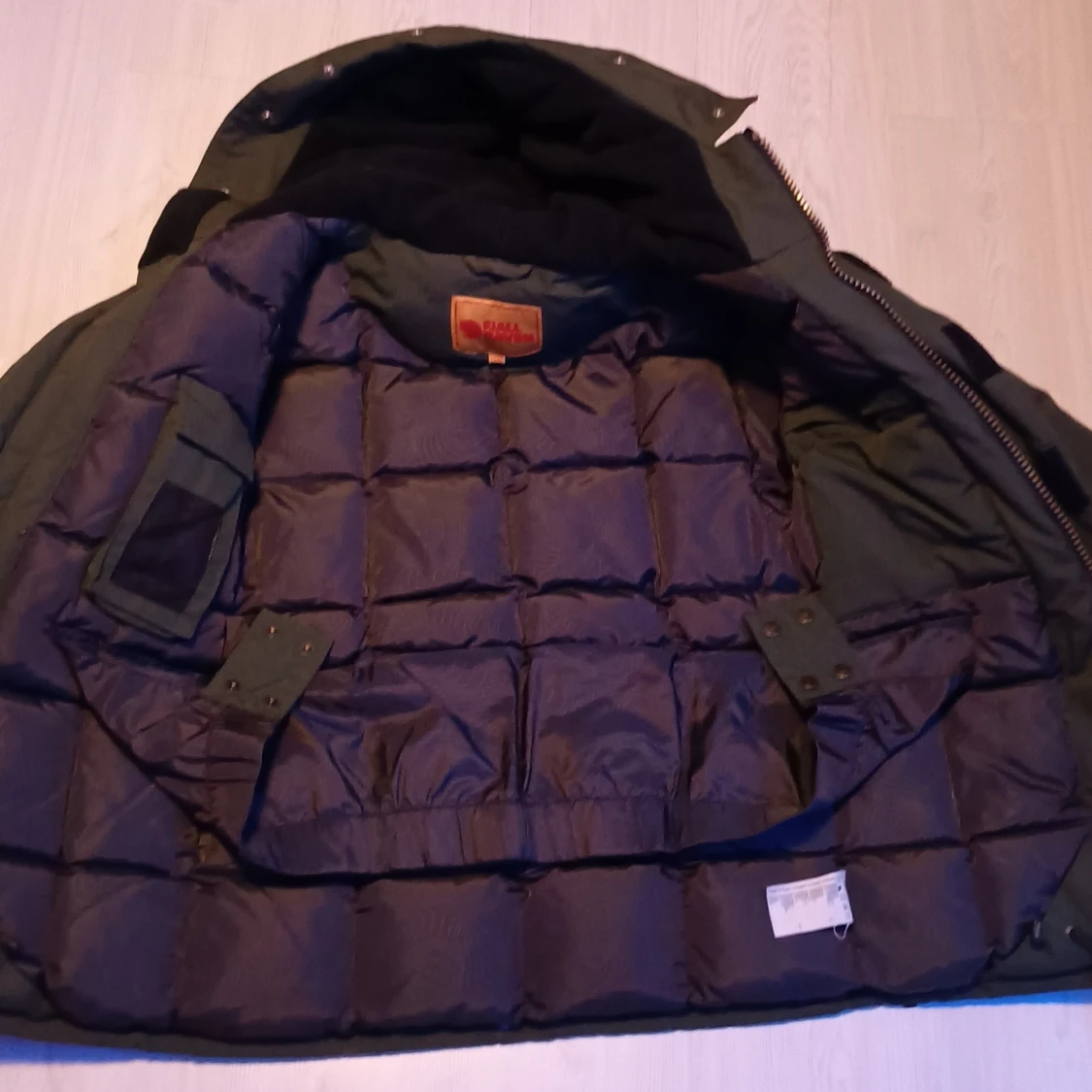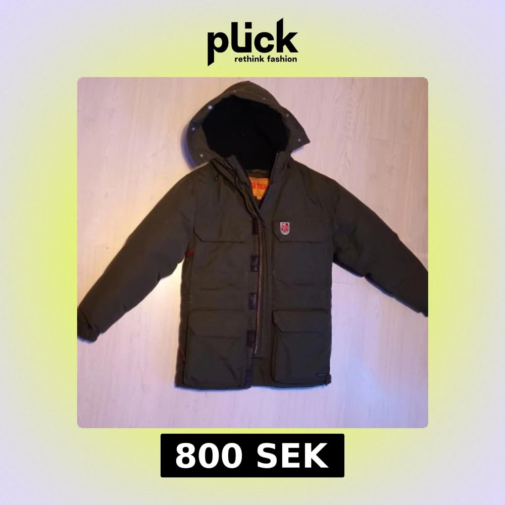 Säljer en grön dunjacka från Fjällräven med huva och flera praktiska fickor. Jackan har quiltad insida, dragkedja och kardborreknäppning framtill. Perfekt för kalla dagar och har den klassiska Fjällräven-loggan på bröstet. Passar 170-177