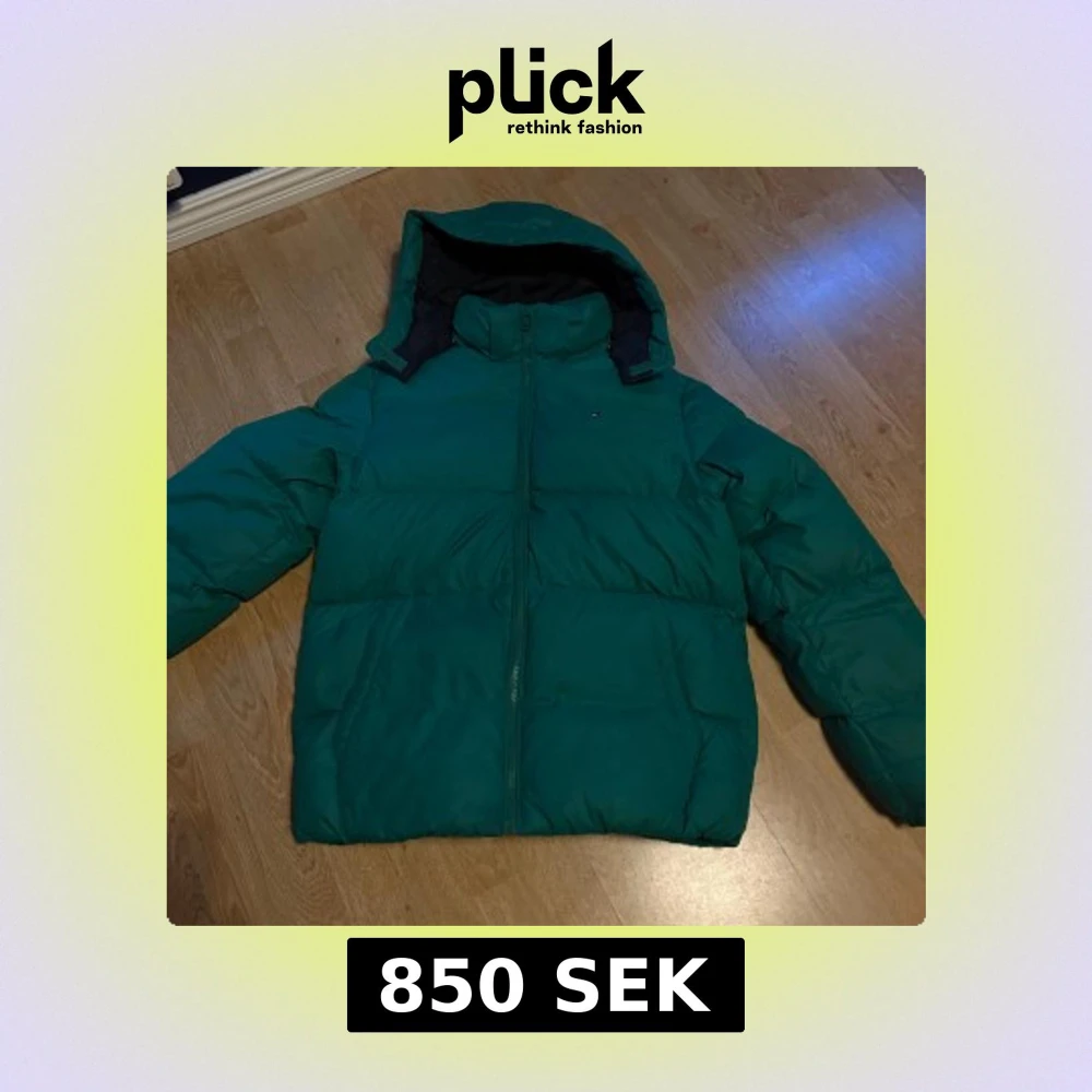 Säljer en grön dunjacka från Tommy Hilfiger med huva och dragkedja. Jackan har en quiltad design och är tillverkad av återvunnet material med dunfyllning. Insidan är svart med logotyp och TH Protect-detaljer. Perfekt för kalla dagar. Knappt använd pga att den är för stor för mig. Storlek 176/S.