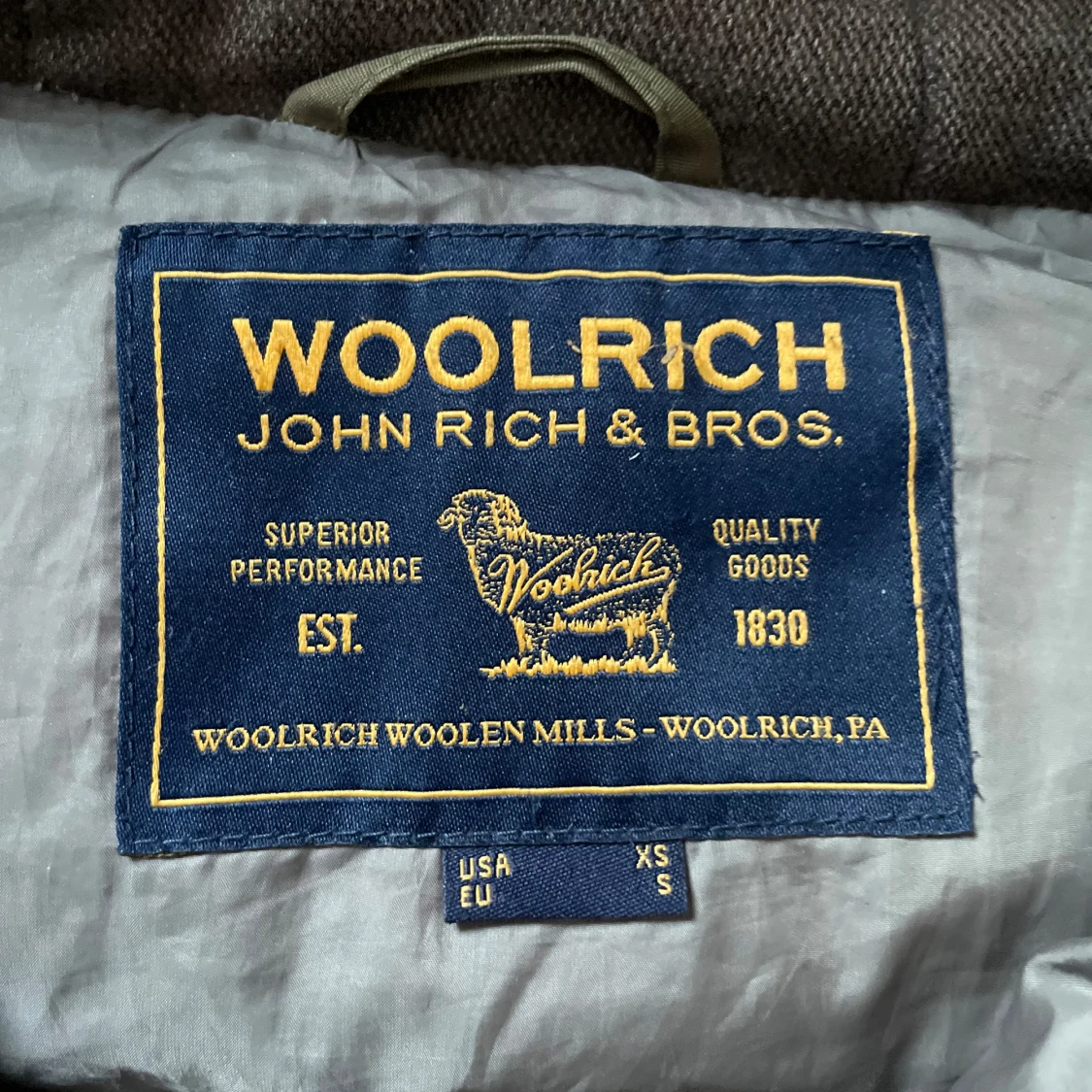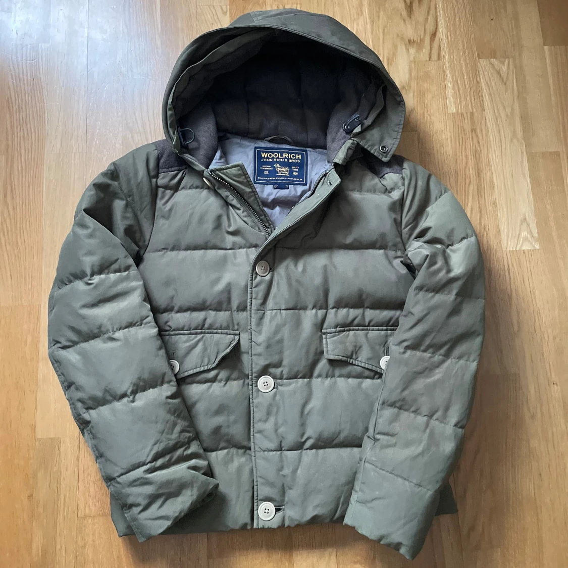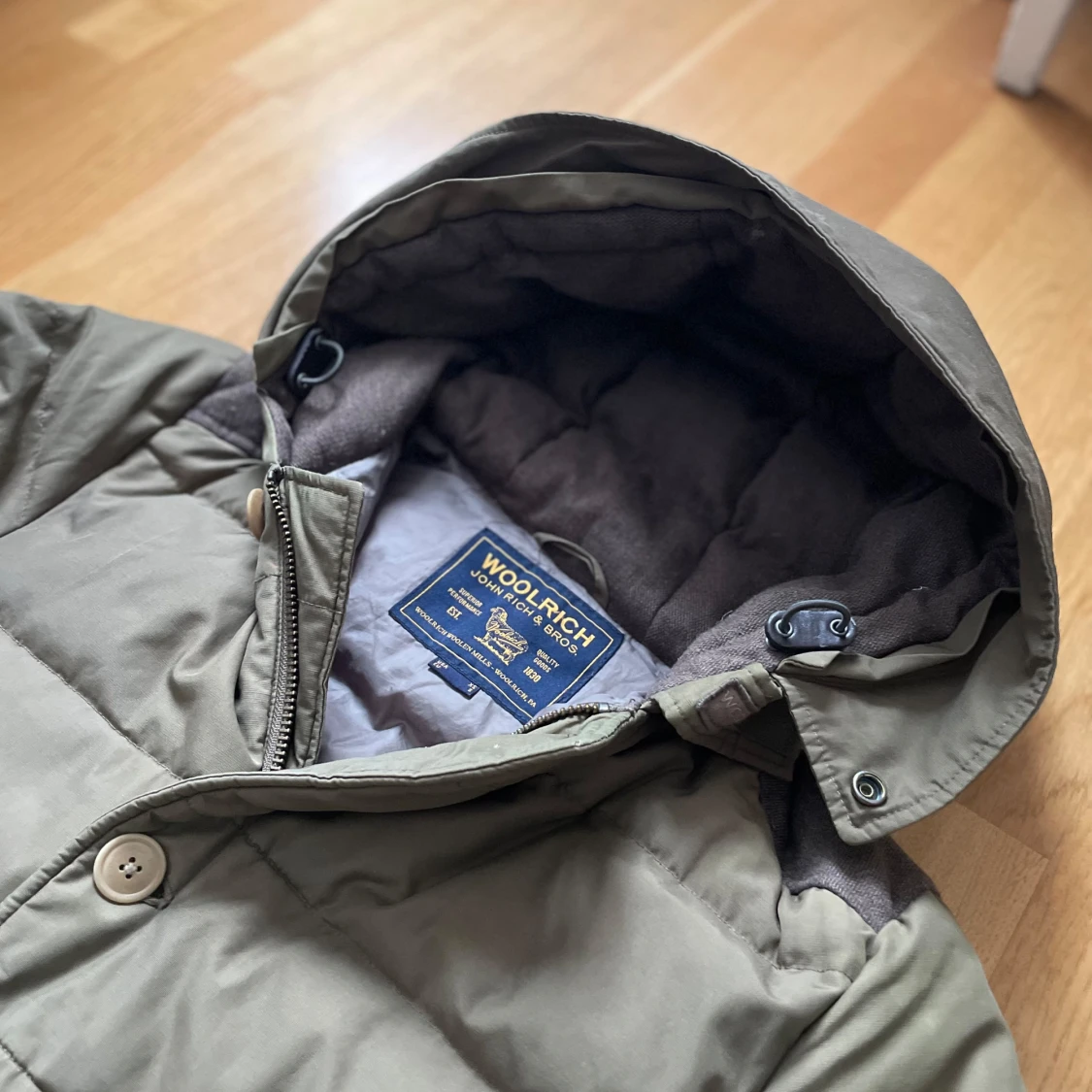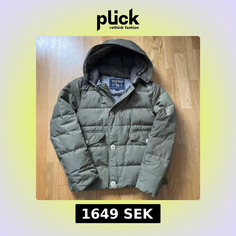 Säljer en grön dunjacka från Woolrich med huva och knappar. Jackan har en quiltad design och är perfekt för kyliga dagar. Den är i grymt skick!