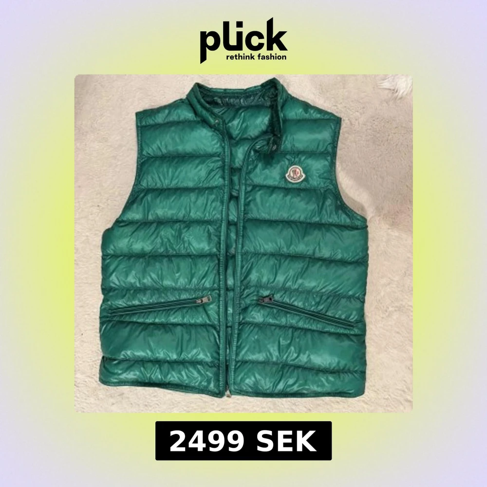 Snygg grön dunväst från Moncler med quiltad design och klassisk logga på bröstet. Västen har två dragkedjeförsedda fickor framtill och hög krage. Perfekt att slänga över en hoodie för extra värme. Materialet är glansigt och känns riktigt lyxigt. Sjävklart äkta mvh Malte.202