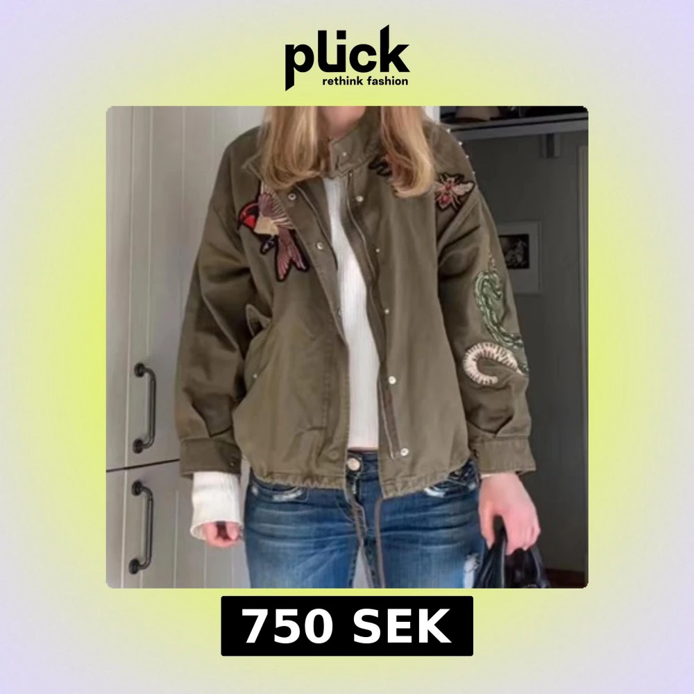 Säljer en olivgrön bomberjacka med snygga broderade detaljer som fågel, blomma och orm på bröst och ärm. Jackan har dragkedja, knappar och snörning nertill för en cool look. Passformen är loose och materialet känns som bomull eller polyester. Skriv privat för fler bilder 🥰