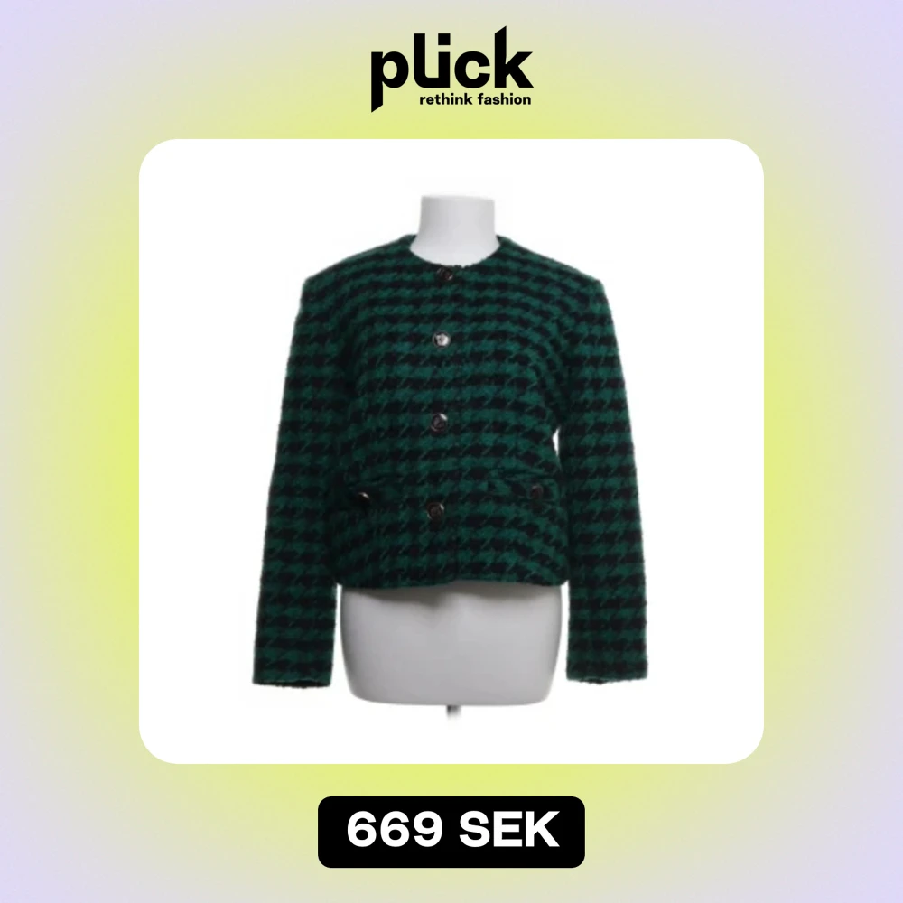 En elegant grön och svart rutig jacka från Sandro Paris. Jackan har långa ärmar och knappar framtill. Den är tillverkad av en blandning av polyester, ull och akryl, med en sekundär tyg av viskos och fickfoder av bomull.
