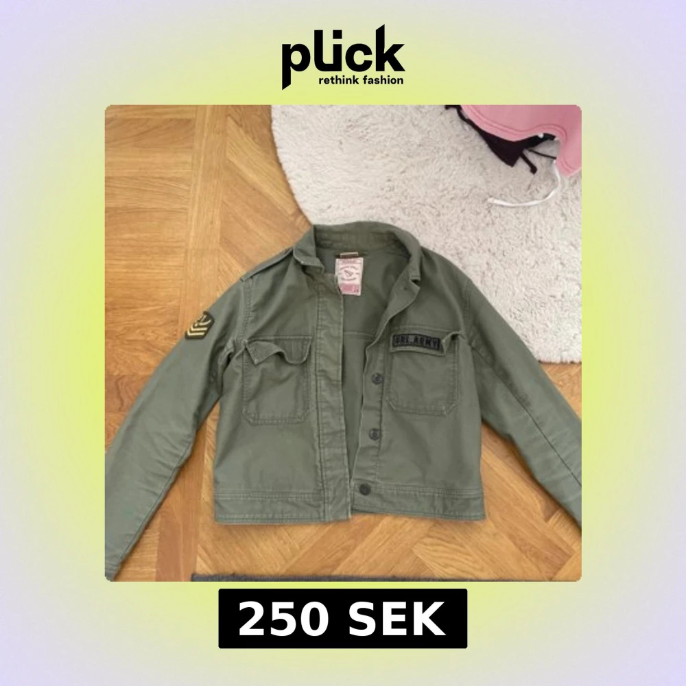 Snygg militärgrön jacka från Pull&Bear Pacific Girls Collection. Jackan har coola detaljer och patch på ärmen, två bröstfickor med lock och knäppning framtill. Perfekt för lager-på-lager och streetstyle.