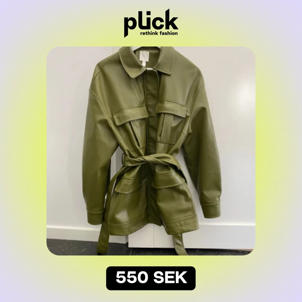 Grön jacka med knyte i midjan (går att ta bort) / Dragkedja & Knappar finns också / Strl L (har använt som oversized, är själv S-M) / Fint skick!