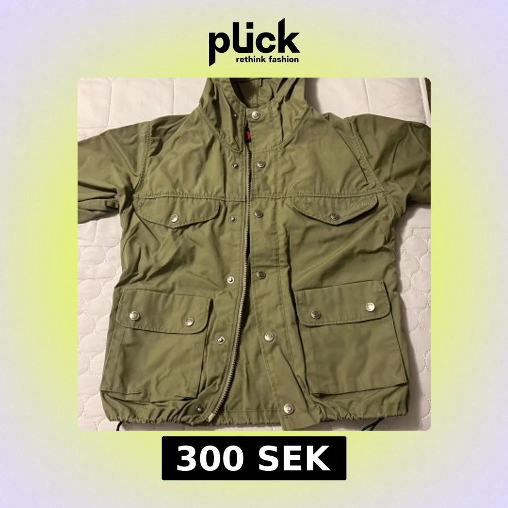 Säljer en grön jacka från Fjällräven i storlek XXS. Jackan har en praktisk huva och flera fickor med knappar. Perfekt för utomhusaktiviteter med sin robusta design och dragkedja framtill.