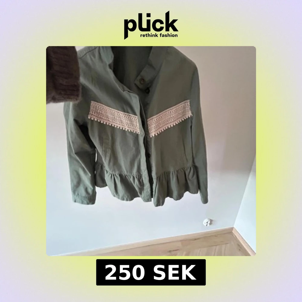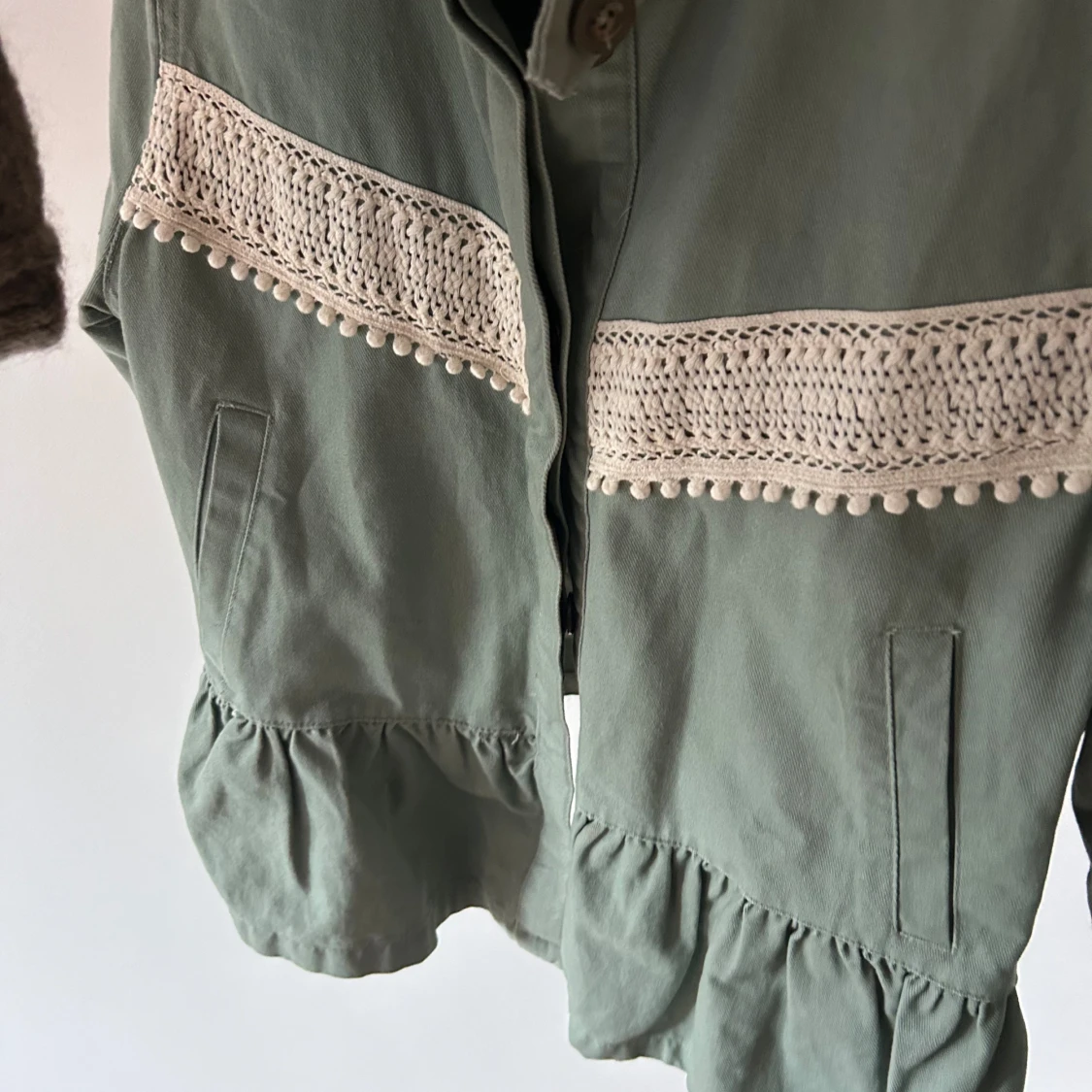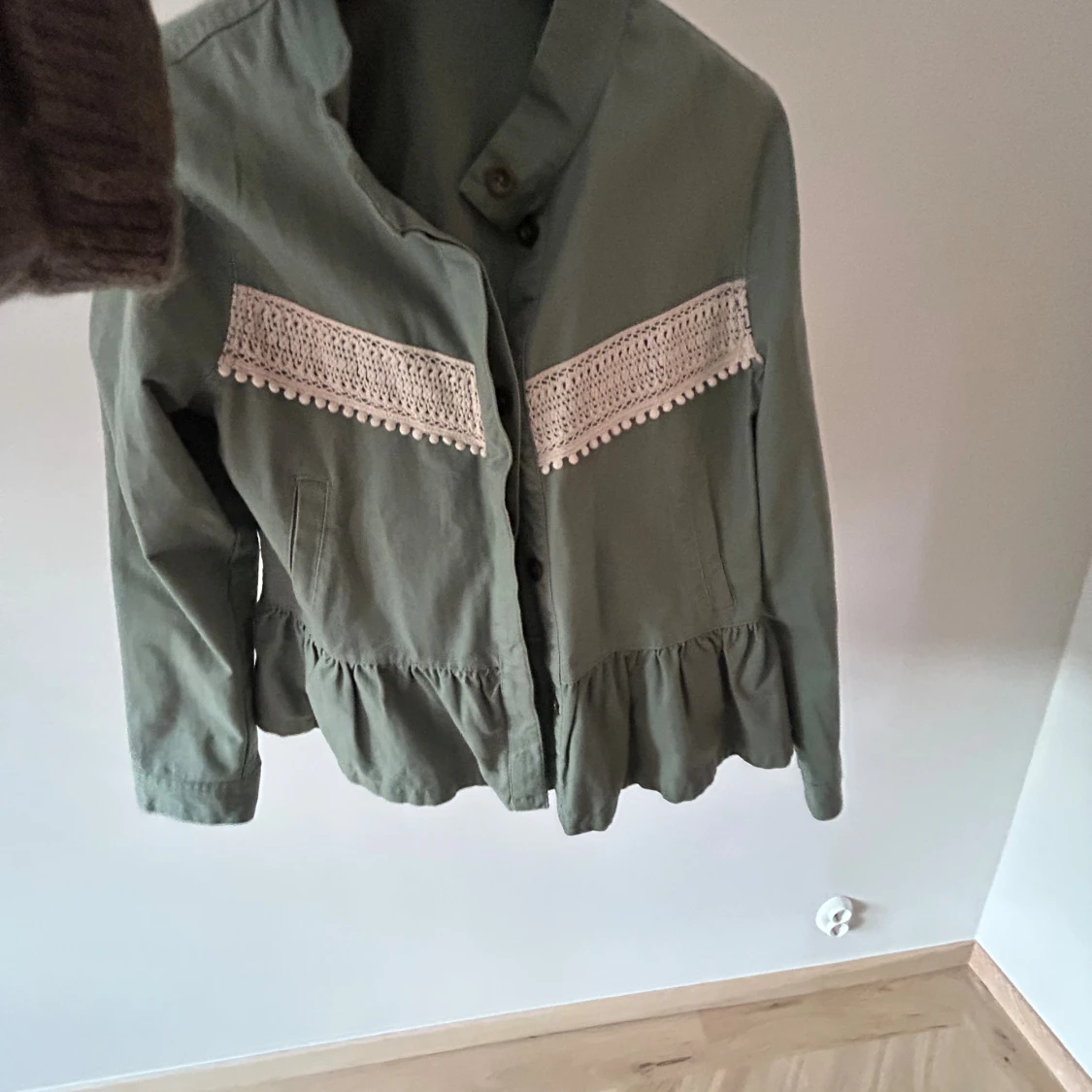 Snygg grön jacka med volangkant nertill och dekorativa spetsband med små bollar över bröstet och ryggen. Jackan har knappar framtill och är långärmad. Köpt begangnad, men aldrig använd själv. Men bra skick!