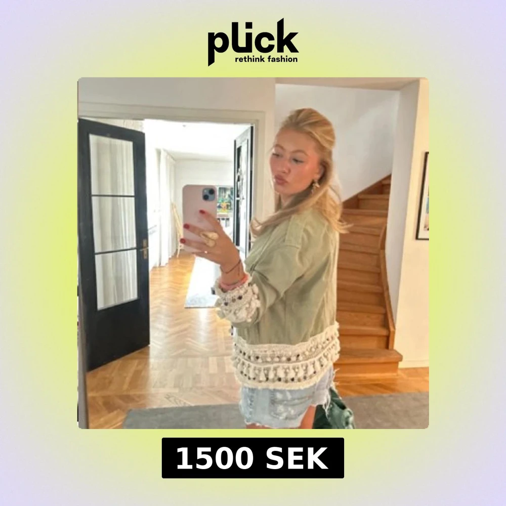 Säljer en superfin grön jacka med vita fransar. Jackan har knappar framtill och är långärmad. Perfekt för vår och höst! Den är i nyskick och passar både till fest och vardag. Skitsnygg till jeans eller kjol!