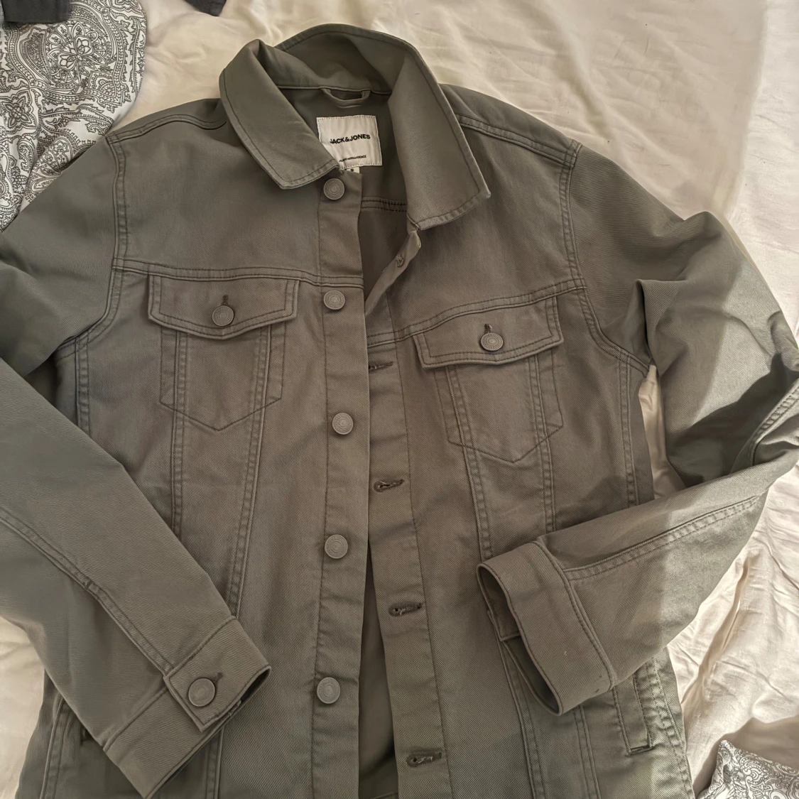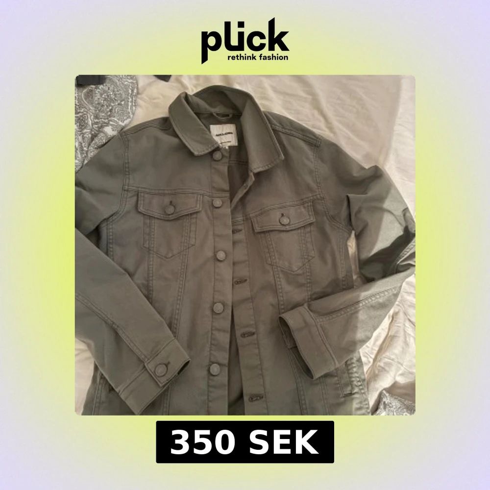 Snygg grön jeansjacka från Jack & Jones med klassisk krage, knappar framtill och två bröstfickor med lock. Jackan har raka linjer och långa ärmar, perfekt för en chill och stilren look. Passar till det mesta och är enkel att matcha.