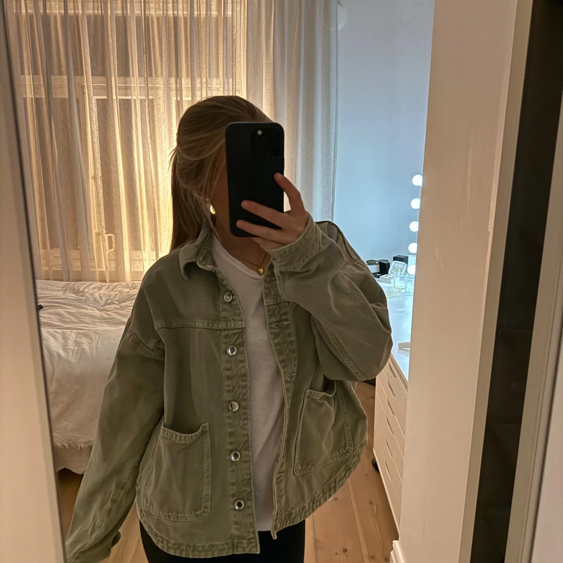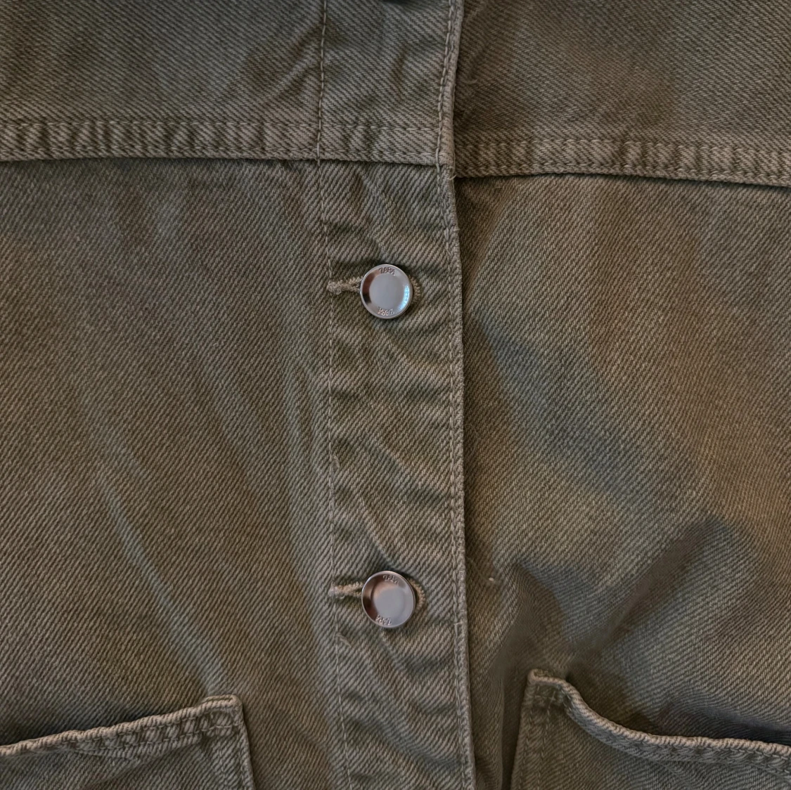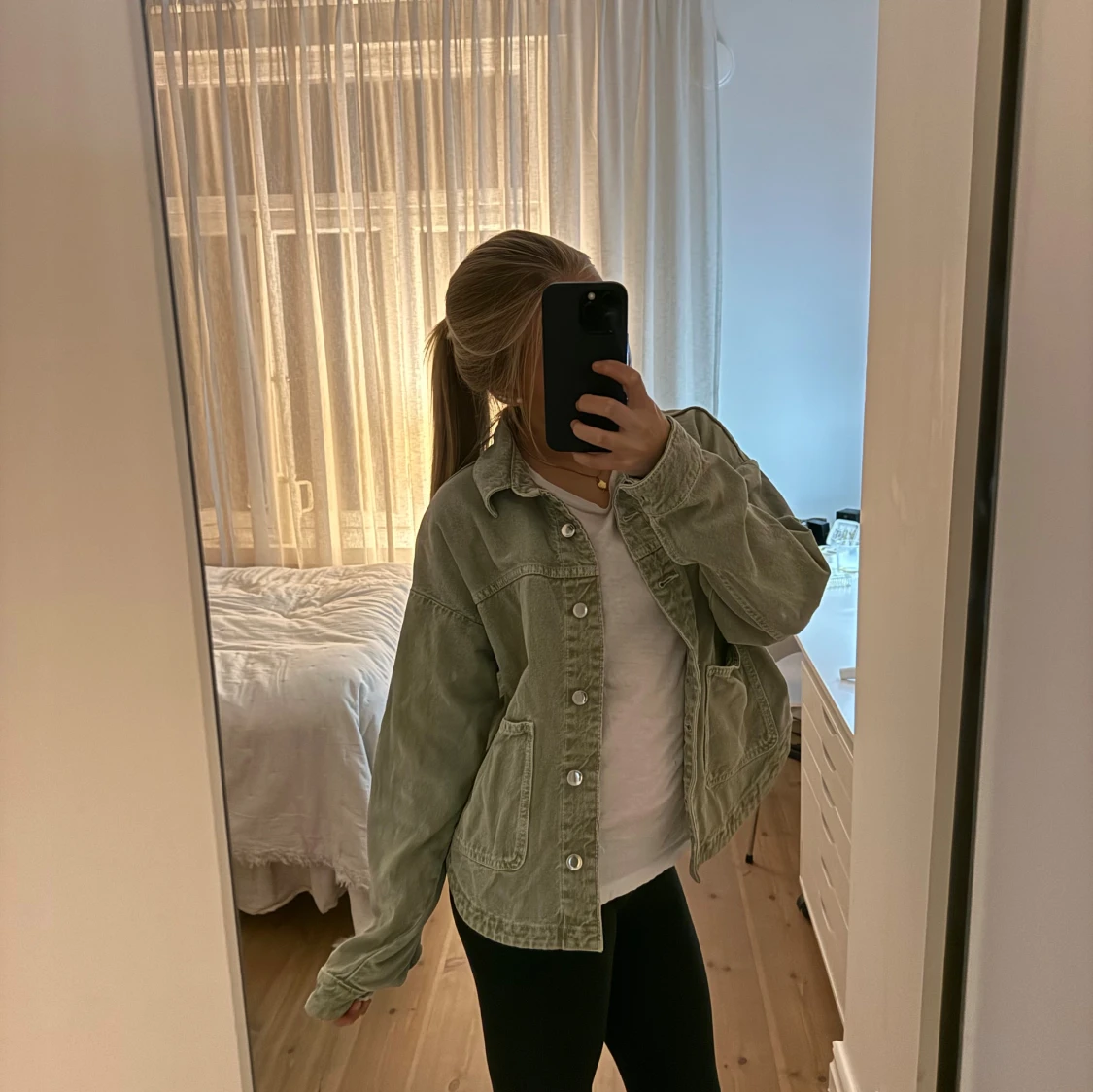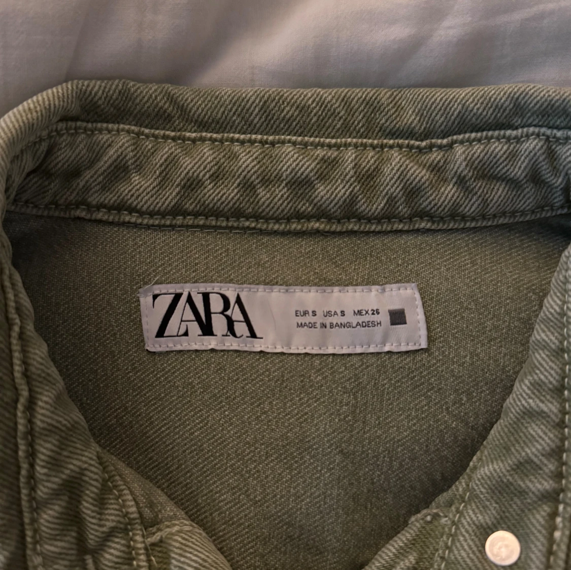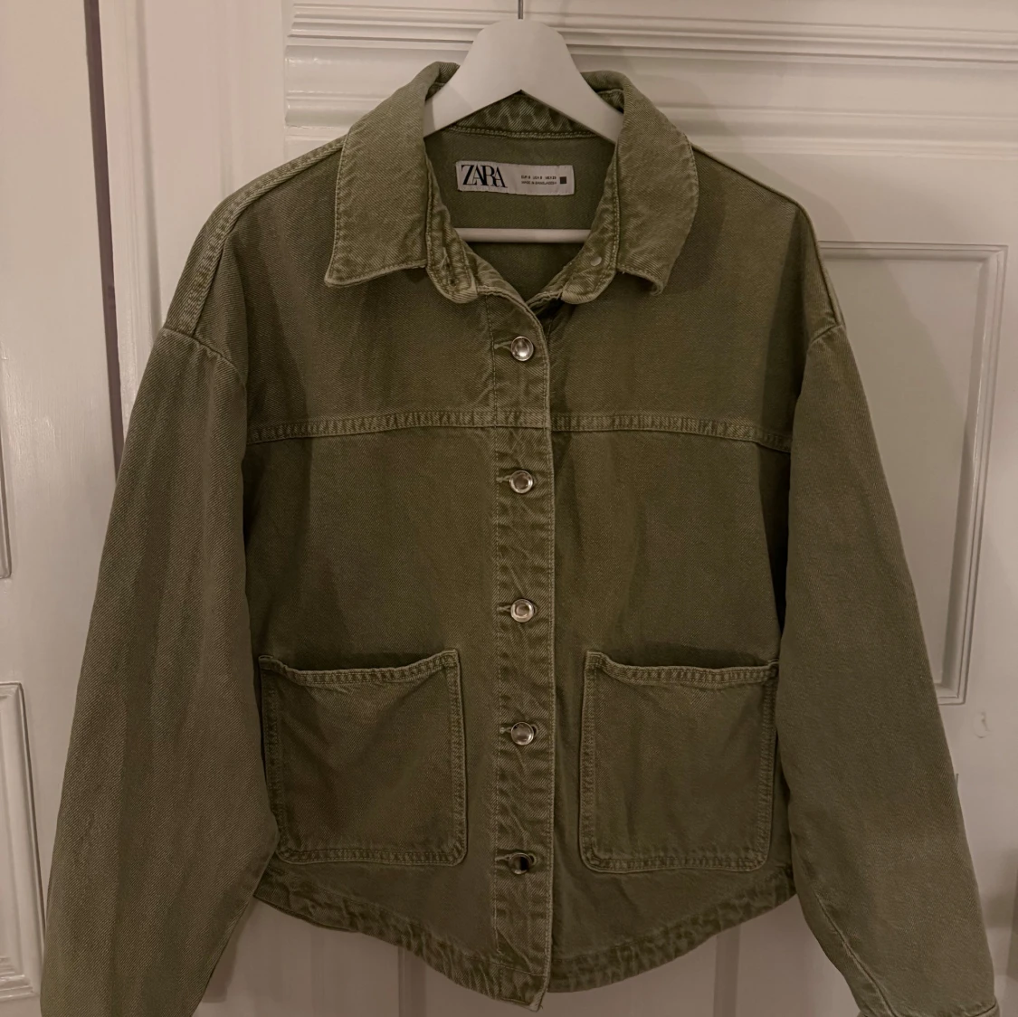 Säljer denna snygga gröna jeansjackan från Zara i storlek S. Jackan har en loose passform, två stora fickor framtill och knappar hela vägen. Jackan skickas nytvättat och struken 🤍