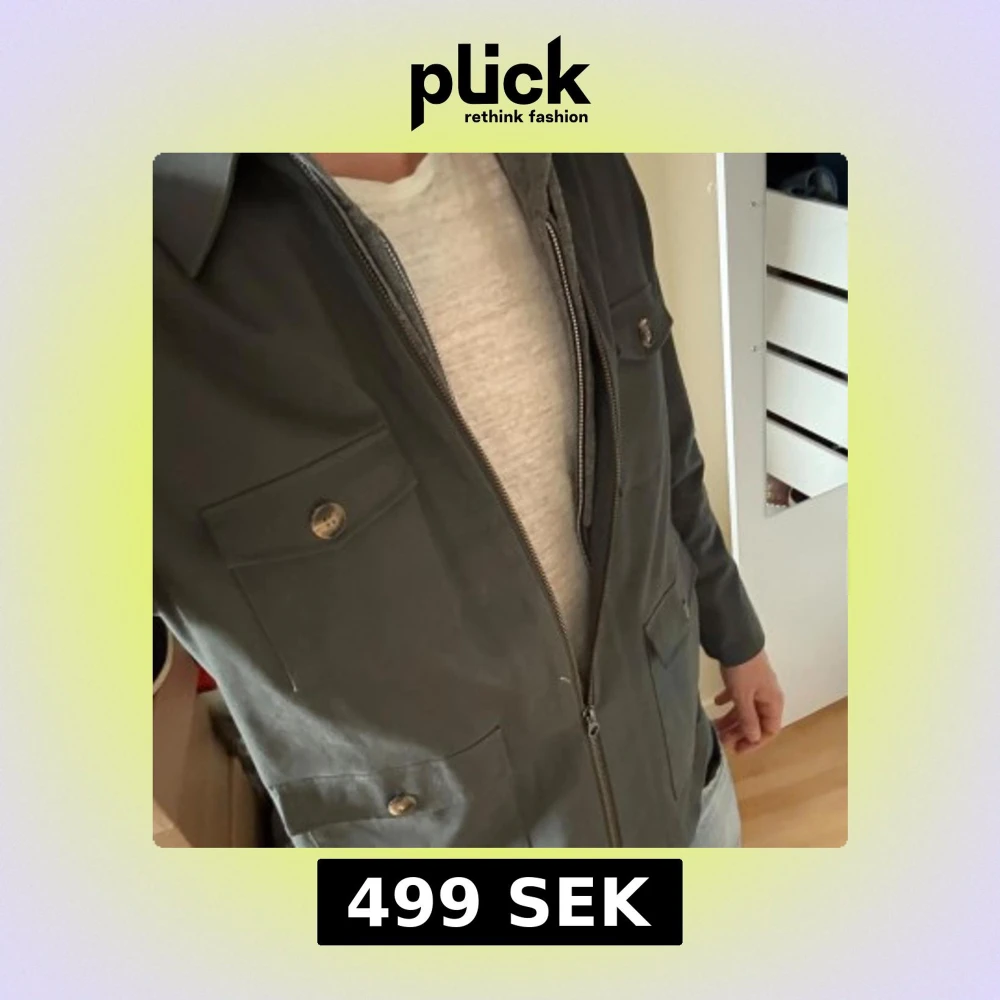 Säljer en mörkgrön jacka med dragkedja framtill och fyra fickor med knappar. Klassisk krage och rak passform. Perfekt för dig som vill ha en stilren och enkel jacka till vardags.