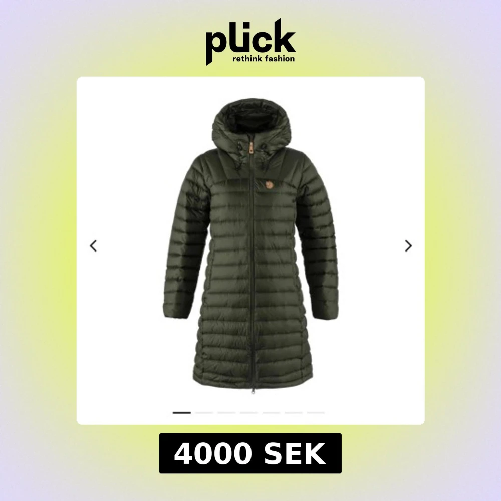 Snygg lång dunjacka från Fjällräven i mörkgrön färg. Jackan har huva, dragkedja hela vägen, diskret logga på bröstet och quiltad design. Perfekt för kalla dagar och riktigt skön att bära. Kommer med tillhörande packpåse.