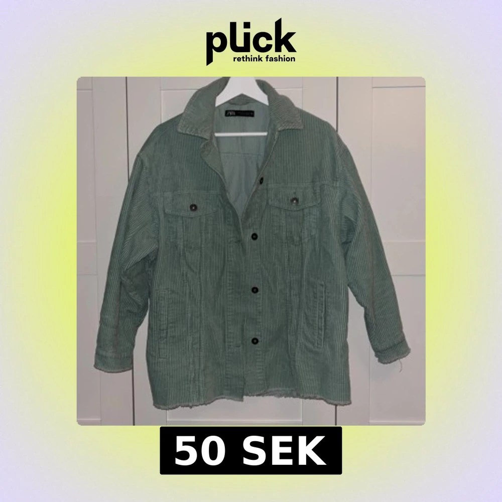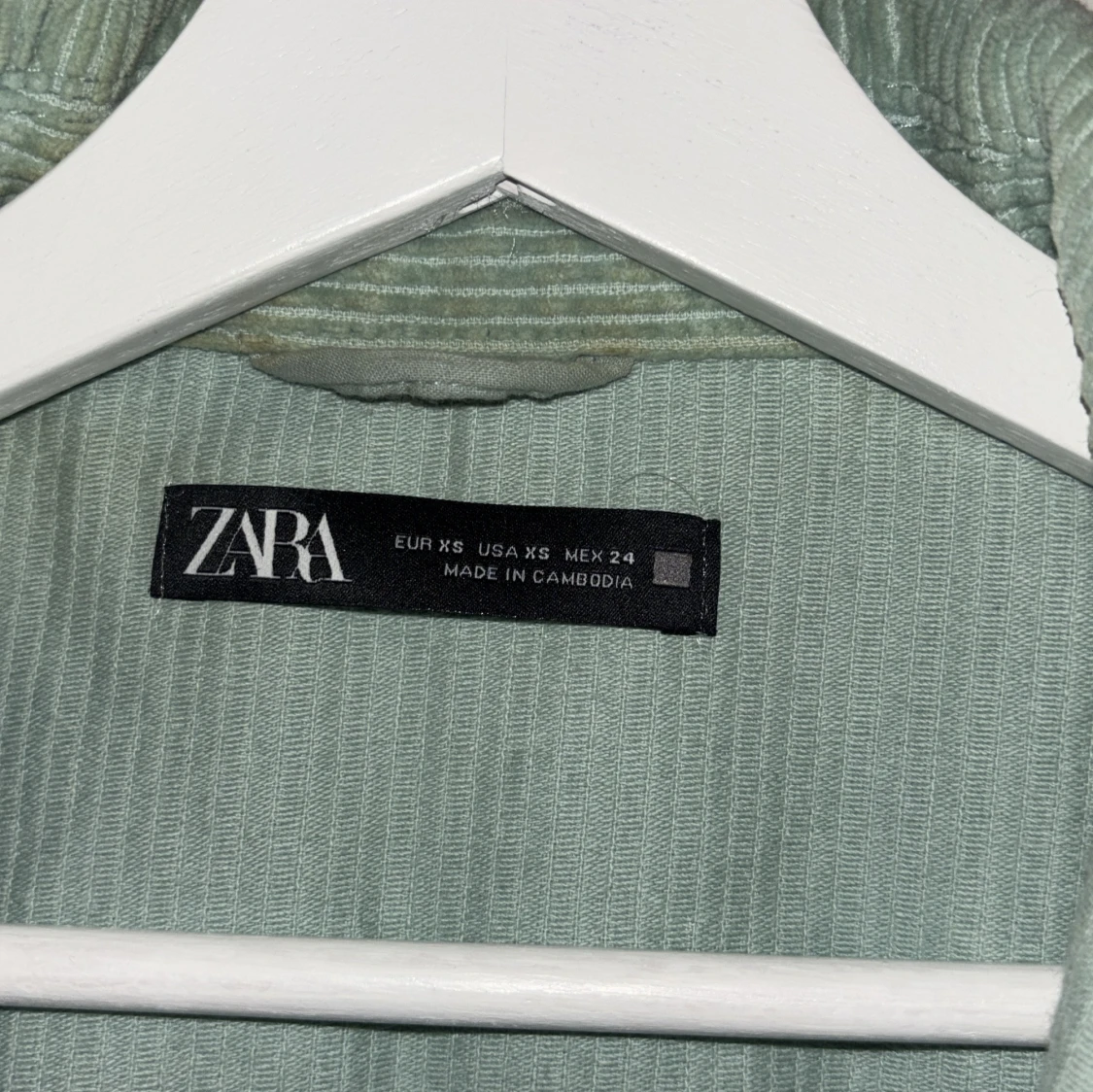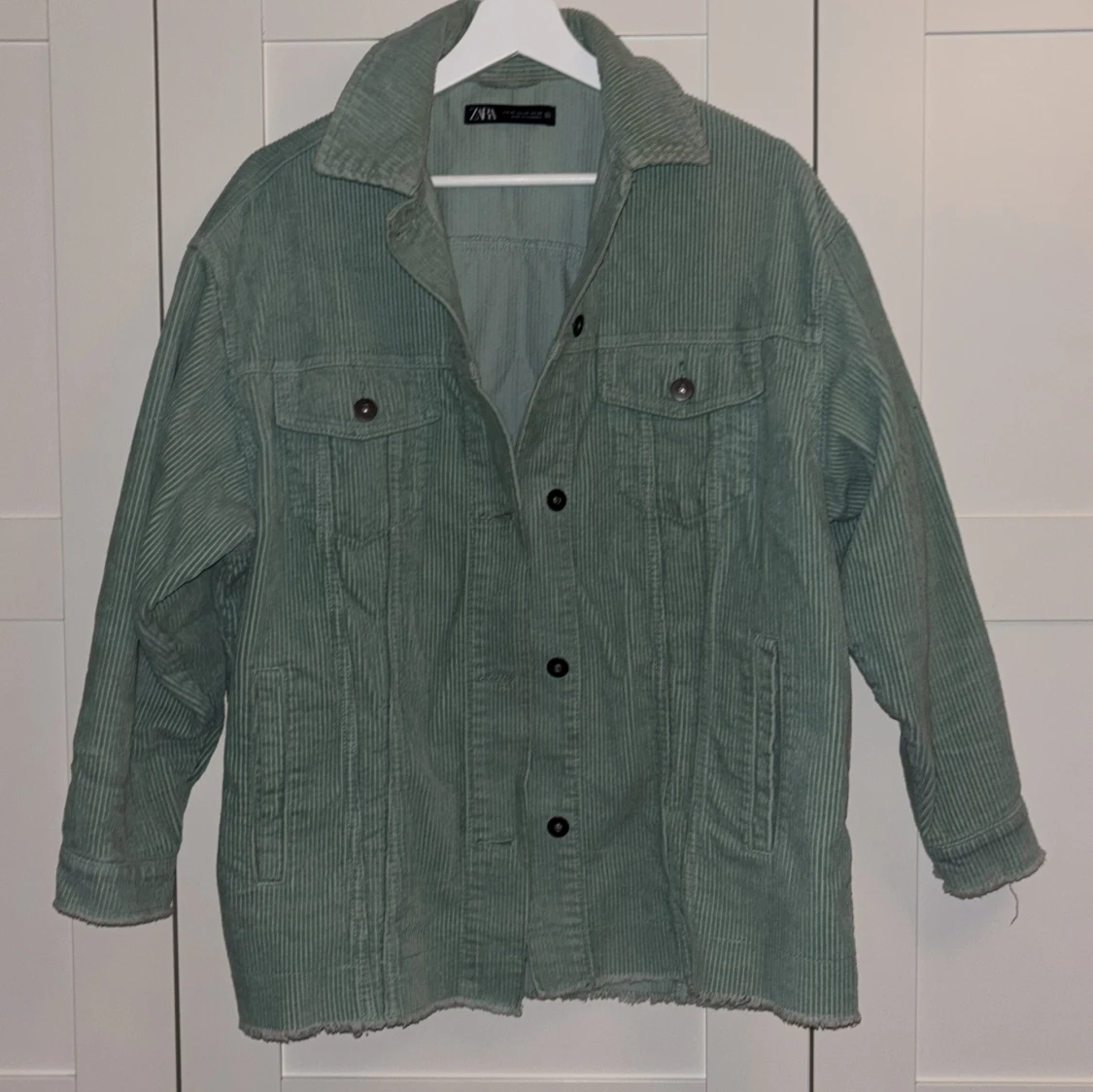 Snygg ljusgrön manchesterjacka från Zara i storlek XS. Jackan har klassisk krage, knappar framtill, två bröstfickor med lock och två sidofickor. Oversized passform och rå kant nertill för en chill vibe. Passar personer med storlek L också, beror på vad man vill ha för passform