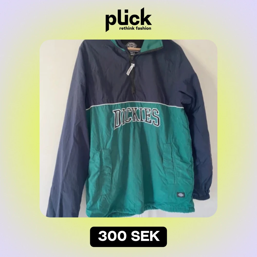 Säljer en snygg och praktisk vindjacka från Dickies i storlek small. Jackan är i en cool kombination av grön och marinblå med Dickies-loggan tryckt på framsidan. Den har en dragkedja framtill och är perfekt för blåsiga dagar. Passar både till vardags och för utomhusaktiviteter.