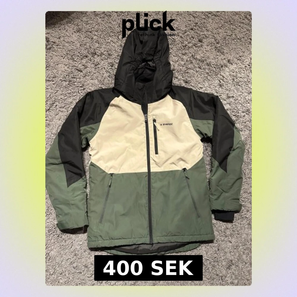 Säljer en snygg skidjacka från Everest i färgerna grön, svart och beige. Jackan har huva, dragkedja framtill och flera praktiska fickor med dragkedja. Perfekt för dig som gillar outdoor och vill ha en jacka med cool färgblockad design. Varm och skön! Mycket bra skick.