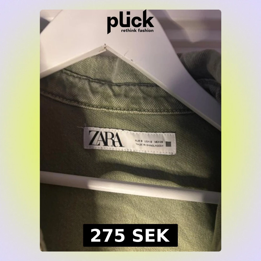 Säljer en trendig grön jacka från Zara i storlek S. Jackan har två stora fickor framtill, klassisk krage och knappar hela vägen. Materialet är bomull och passformen är normal.